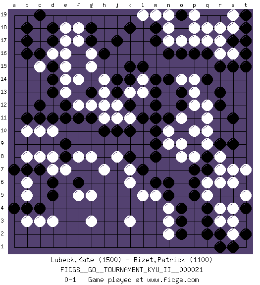 Last move : 0-1 2011 January 4 10:33:0 [Event "FICGS__GO__TOURNAMENT_KYU_II__000021"] [Site "FICGS"] [Date "2010.04.29"] [Round "1"] [Black "Lubeck,Kate"] [White "Bizet,Patrick"] [Result "0-1"] [Rating 1 "1500"] [Rating 2 "1100"] 1.q16 d3 2.c16 r4 3.j17 e17 4.g17 e15 5.d14 f14 6.c11 q10 7.d5 d8 8.c7 c8 9.c4 c3 10.r13 k3 11.q3 r3 12.q4 q5 13.p5 q6 14.p6 n3 15.o4 o17 16.m17 q17 17.p16 p17 18.n16 r16 19.r15 s16 20.s15 f8 21.o3 n4 22.n5 m5 23.n6 g3 24.m6 l5 25.f11 h14 26.d18 f5 27.q7 r7 28.q8 r8 29.r9 q9 30.s9 s7 31.s11 p8 32.p7 o8 33.m8 n9 34.m9 n10 35.m10 n12 36.m11 p12 37.m12 n13 38.n11 o11 39.m13 g12 40.g11 h11 41.h10 j11 42.j10 k13 43.m14 p13 44.q14 f12 45.e11 b8 46.b7 b3 47.b4 b5 48.a4 b6 49.a7 d7 50.d6 h7 51.k8 k7 52.l7 k6 53.o13 o14 54.n14 p14 55.o12 p10 56.o16 n18 57.m18 f18 58.g18 b10 59.b11 d16 60.d17 c15 61.d15 e16 62.b16 c17 63.b17 c18 64.b18 e18 65.c19 q12 66.r12 q11 67.k15 g16 68.h16 g15 69.r2 s2 70.q2 c10 71.r5 r6 72.s5 s4 73.t4 s3 74.s1 s6 75.t6 t7 76.t2 t5 77.r1 l14 78.l15 e13 79.d13 k11 80.k10 n2 81.o2 g8 82.k14 l13 83.j13 j12 84.j14 h13 85.g13 f17 86.k12 d12 87.e12 e14 88.c12 d10 89.d11 h12 90.l11 j8 91.s17 r17 92.t16 s18 93.t18 s19 94.t15 n17 95.o19 n19 96.q19 q18 97.r19 t17 98.o10 o9 99.s17 p18 100.t17 p19 101.t19 r18 102.f6 g5 103.e8 e7 104.e9 m19 105.k18 l19 0-1 This go game has been lost on time (started : 2010.04.29 10:44:40) Here are the names of the openings (joseki) played in the four corners : Corner d4 : d3 d5 Komoku (Somok, Xiao~mu`) 3-4 Point. The komoku (3-4) point is the traditional corner enclosure move.. Ikken Takagakari (Hankan Nop'dakeolch'im, Yi Gaogua`jiao~, 1-Space High Approach). The 5-4 approach move has become more popular in modern times, as modern Go emphasizes speed and influence. Corner q4 : r4 q3 Komoku (Somok, Xiao~mu`) 3-4 Point. The komoku (3-4) point is the traditional corner enclosure move.. Player White won this Go (weiqi, baduk) game. Follow this game move after move (download)Connect with good shape. (Anonymous) Chess is everything: art, science and sport. (Anatoly Karpov)