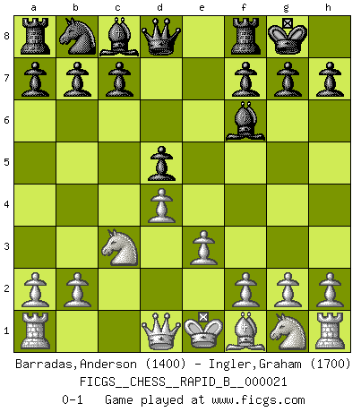 Last move : 0-1 2006 December 12 18:11:13 [Event "FICGS__CHESS__RAPID_B__000021"] [Site "FICGS"] [Date "2006.10.31"] [Round "1"] [White "Barradas,Anderson"] [Black "Ingler,Graham"] [Result "0-1"] [WhiteElo "1400"] [BlackElo "1700"] 1.d4 d5 2.c4 e6 3.Nc3 Nf6 4.Bg5 Be7 5.e3 O-O 6.Bxf6 Bxf6 7.cxd5 exd5 0-1 This chess game has been lost on time (started : 2006.10.31 23:12:19) QGD : 4.Bg5 Be7, 5.e3 O-O Kingside Castling by player Black (move 5) Player Black won this chess game. Follow this game move after move (download)Those who say they understand Chess, understand nothing. (Robert Hubner) Die Neutralität betrachte ich als eine schwere Krankheit. (Viktor Kortschnoi) Diferente gente reacciona diferentemente en aceptar la derrota. (Bobby Fischer) Assurément je connaissais par expérience le mystérieux attrait de ce jeu royal, le seul entre tous les jeux inventés par les hommes qui échappe souverainement à la tyrannie du hasard, le seul où l'on ne doive sa victoire qu'à son intelligence ou plutôt à une certaine forme d'intelligence. Mais n'est-ce pas déjà le limiter injurieusement que d'appeler les échecs un jeu ? N'est-ce pas une science, un art ou quelque chose qui, comme le cercueil de Mahomet entre ciel et terre, est suspendu entre l'un et l'autre, et qui réunit un nombre incroyable de contraires ? [...] C'est une pensée qui ne mène à rien, une mathématique qui n'établit rien, un art qui ne laisse pas d'uvre, une architecture sans matière; et il l'a prouvé néanmoins qu'il était plus durable, à sa manière, que les livres ou que tout autre monument, ce jeu unique qui appartient à tous les peuples et à tous les temps, et dont personne ne sait quel dieu en fit don à la terre pour tuer l'ennui, pour aiguiser l'esprit et stimuler l'âme. Où commence-t-il, où finit-il ? (Stefan Zweig) Nowadays, anyone who cannot speak English and is incapable of using the Internet is regarded as backward. (Al-Waleed bin Talal)