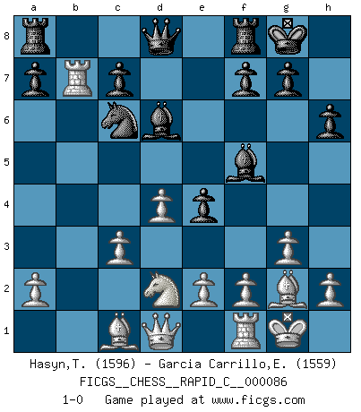 Last move : 1-0 2010 July 12 21:25:8 [Event "FICGS__CHESS__RAPID_C__000086"] [Site "FICGS"] [Date "2010.04.29"] [Round "1"] [White "Hasyn,Thomas"] [Black "Garcia Carrillo,Exal"] [Result "1-0"] [WhiteElo "1596"] [BlackElo "1559"] 1.c4 e5 2.g3 Nf6 3.Bg2 d5 4.cxd5 Nxd5 5.Nf3 Nc6 6.Nc3 Nxc3 7.bxc3 Bd6 8.O-O O-O 9.Rb1 h6 10.d4 e4 11.Nd2 Bf5 12.Rxb7 1-0 This chess game has been lost on time (started : 2010.04.29 19:38:8) English Opening Kingside Castling by player White (move 8) Kingside Castling by player Black (move 8) Player White won this chess game. Follow this game move after move (download)Spassky will not be psyched out by Fischer. (Mike Goodall) Im Schach gewinnt jeder. Hat man Freunde am Spiel - und das ist die Hauptsache - ist auch der Verlust einer Partie kein Unglück. (David Bronstein) El Ajedrez, como la música, como el amor, tiene el poder de hacer feliz a la gente. (Siegbert Tarrasch) Les échecs, c'est la lutte contre l'erreur. (Johannes Zukertort) Shallow men believe in luck. Strong men belive in cause and effect. (Ralph Waldo Emerson)