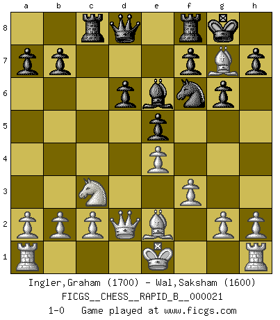 Last move : 1-0 2006 December 23 19:59:40 [Event "FICGS__CHESS__RAPID_B__000021"] [Site "FICGS"] [Date "2006.10.31"] [Round "1"] [White "Ingler,Graham"] [Black "Wal,Saksham"] [Result "1-0"] [WhiteElo "1700"] [BlackElo "1600"] 1.e4 c5 2.Nf3 Nc6 3.d4 cxd4 4.Nxd4 d6 5.Nc3 Nf6 6.Be2 g6 7.f3 Bg7 8.Be3 O-O 9.Qd2 Nxd4 10.Bxd4 e5 11.Be3 Be6 12.Bh6 Rc8 13.Bxg7 1-0 This chess game has been lost on time (started : 2006.10.31 23:12:19) Sicilian defense Kingside Castling by player Black (move 8) Player White won this chess game. Follow this game move after move (download)Pawns: they are the soul of this game, they alone form the attack and defense. (Philidor) Immer nach dem besten Zug zu suchen ist ziemlich unpraktisch. (Nigel Short) Buenas posiciones no logran ganar juegos, buenas movidas sí. (Gerald Abrahams) Seul un grand joueur sait à quel point il joue faiblement. (Xavier Tartacover) Never risk one's whole fortune unless supported by one's entire army. (Niccolo Machiavelli)