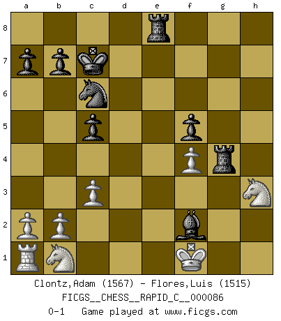 Last move : 0-1 2010 May 25 17:10:30 [Event "FICGS__CHESS__RAPID_C__000086"] [Site "FICGS"] [Date "2010.04.29"] [Round "1"] [White "Clontz,Adam"] [Black "Flores,Luis"] [Result "0-1"] [WhiteElo "1567"] [BlackElo "1515"] 1.e4 c5 2.Qh5 e6 3.f4 Nf6 4.Qf3 Nc6 5.c3 d5 6.d3 Be7 7.g4 h6 8.h4 h5 9.g5 Ng4 10.Bh3 f5 11.gxf6 gxf6 12.Bxg4 hxg4 13.Qxg4 dxe4 14.dxe4 f5 15.exf5 exf5 16.Qg6+ Kd7 17.Rh3 Rg8 18.Rd3+ Kc7 19.Rxd8 Rxg6 20.Rxc8+ Rxc8 21.Be3 Bxh4+ 22.Kf1 Re8 23.Bf2 Rg4 24.Nh3 Bxf2 0-1 Sicilian defense Player Black won this chess game. Follow this game move after move (download)No Chess Grandmaster is normal; they only differ in the extent of their madness. (Viktor Korchnoi) Bis zum Jahr 1971 verlief in meiner Schachkariere alles glatt. Dieses dramatische Match [Fischer-Taimanov 6:0] machte mein Leben zur Hölle. (Mark Taimanov) El ganar no lo es todo... pero el perder es nada. (Mednis) La vérité est comme le meilleur coup aux échecs : elle existe, mais il faut la chercher. (Arturo Perez-Reverte) Now the reason the enlightened prince and the wise general conquer the enemy whenever they move and their achievements surpass those of ordinary men is foreknowledge. (Sun Tzu)