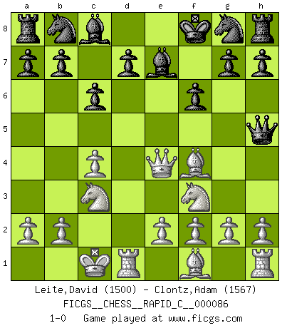 Last move : 1-0 2010 May 10 16:23:10 [Event "FICGS__CHESS__RAPID_C__000086"] [Site "FICGS"] [Date "2010.04.29"] [Round "1"] [White "Leite,David"] [Black "Clontz,Adam"] [Result "1-0"] [WhiteElo "1500"] [BlackElo "1567"] 1.c4 e5 2.Nc3 Qh4 3.Nf3 Qh5 4.d4 exd4 5.Qxd4 c6 6.Bg5 f6 7.Qe4+ Be7 8.Bf4 Kf8 9.O-O-O 1-0 English Opening Queenside Castling by player White (move 9) Player White won this chess game. Follow this game move after move (download)The tactician must know what to do whenever something needs doing; the strategist must know what to do when nothing needs doing. (Savielly Tartakover) Oft bringt ein stiller Zug das Erdbeben. (Richard Reti) El Jaque al descubierto es el bombardero del tablero. (Reuben Fine) Je ne suis pas le dernier à jouer lâchement des coups douteux pendant le zeïtnot de l'adversaire pour l'achever: en effet les coups qui font le plus peur sont ceux que l'on ne comprend pas. Je me fais souvent peur quand je joue. (Un professeur anonyme) Every man's memory is his private literature. (Aldous Huxley)