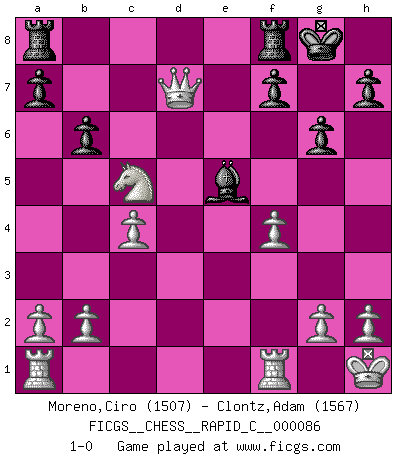 Last move : 1-0 2010 May 5 23:9:25 [Event "FICGS__CHESS__RAPID_C__000086"] [Site "FICGS"] [Date "2010.04.29"] [Round "1"] [White "Moreno,Ciro"] [Black "Clontz,Adam"] [Result "1-0"] [WhiteElo "1507"] [BlackElo "1567"] 1.c4 e5 2.Nc3 Qh4 3.Nf3 Qh5 4.d4 d6 5.e4 Be7 6.Be2 Bg4 7.Qb3 b6 8.dxe5 dxe5 9.Qb5+ Nd7 10.Nxe5 Qxe5 11.Bxg4 Ngf6 12.Bf5 g6 13.Bxd7+ Nxd7 14.O-O Bd6 15.f4 Qd4+ 16.Kh1 Qc5 17.e5 c6 18.Qa4 Bc7 19.Be3 Qxe3 20.Qxc6 O-O 21.Qxd7 Qc5 22.Ne4 Bxe5 23.Nxc5 1-0 English Opening Kingside Castling by player White (move 14) Kingside Castling by player Black (move 20) Player White won this chess game. Follow this game move after move (download)Play the opening like a book, the middle game like a magician, and the endgame like a machine. (Spielmann) Karpov ist ein Museumsstück. (Garry Kasparov) Cuando tu casa esta en llamas, no puedes ser molestado por tus vecinos. O, como decinos en Ajedrez, si tu Rey esta bajo ataque, no te preocupa perder un Peón del lado de la Reina. (Gary Kasparov) Mon pion favori sur ma case favorite ! Bronstein en parlant d'un coup de pion en h5 quand il avait les Noirs. Information on the Internet is subject to the same rules and regulations as conversation at a bar. (George Lundberg)