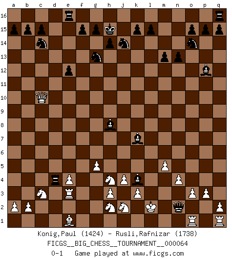 Last move : 0-1 2010 September 2 22:5:31 [Event "FICGS__BIG_CHESS__TOURNAMENT__000064"] [Site "FICGS"] [Date "2010.04.30"] [Round "1"] [White "Konig,Paul"] [Black "Rusli,Rafnizar"] [Result "0-1"] [WhiteElo "1424"] [BlackElo "1738"] 1.j2-k4 m15-m13 2.h1-o7 j15-h13 3.n2-n4 e15-e13 4.o1-e10 g16-f14 5.e2-e4 h16-n11 6.o2-o3 n11-p11 7.p2-p3 p11-f2 8.g1-f3 f2-g3 9.k4-h5 g3-n9 10.f1-a6 d15-d13 11.e10-h13 f14-h13 12.a6-h13 j14-h13 13.o7-h13 h15-g13 14.h13-h12 k16-j14 15.h12-a12 b16-c14 16.d2-d4 n15-n13 17.m2-m4 p16-o14 18.l1-o4 c16-l8 19.j3-j4 l16-p12 20.g2-g4 f16-b12 21.c1-d2 o16-e7 22.k1-l3 n9-c9 23.g4-g5 c9-c2 24.b1-c3 c2-d3 25.e1-e3 d3-c4 26.j1-j2 c4-j10 27.a12-e8 e7-g9 28.a1-f1 l8-h5 29.e8-e5 g9-h8 30.e5-d5 j10-j8 31.p1-n2 j16-h15 32.j2-h1 h5-j6 33.m4-m5 j8-h7 34.n2-l1 m16-m14 35.h1-j2 m14-k14 36.d5-d13 h7-k9 37.k2-k3 a16-d16 38.d13-l6 k14-l14 39.l6-g10 l14-l3 40.o4-m2 l3-l2 41.j2-k1 l2-m2 42.m1-m2 b12-m2 43.f3-h4 j6-k7 44.g10-c10 e13-e12 45.l1-j2 d16-d4 46.d2-e1 k9-h7 47.k1-l2 h7-n2 48.f1-o1 m2-k4 0-1 Follow this game move after move (download)Chess is the gymnasium of the mind. (Blaise Pascal) Gott hat gewollt, dass ich Champion werde. (Surab Azmajparaschvili) Aquellos que dicen entender al Ajedrez, no entienden nada. (Robert Hubner) La solitude du joueur d'Echecs à l'approche du mat est semblable à celle du condamné. (Francis Szpiner) Happy endings are just stories that haven't finished yet. (Jane Smith in Mr & Mrs Smith)