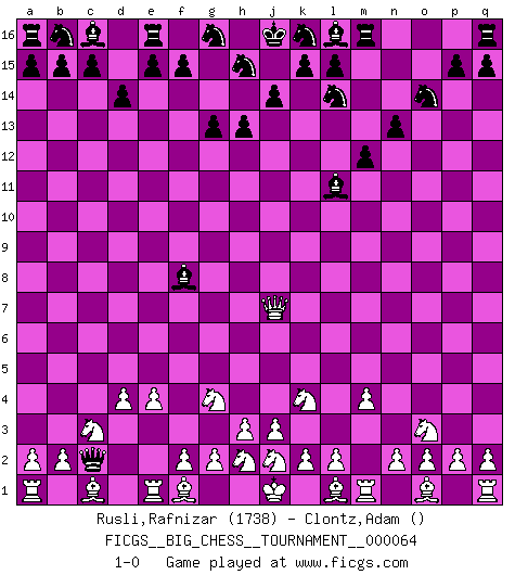 Last move : 1-0 2010 June 30 21:59:36 [Event "FICGS__BIG_CHESS__TOURNAMENT__000064"] [Site "FICGS"] [Date "2010.04.30"] [Round "1"] [White "Rusli,Rafnizar"] [Black "Clontz,Adam"] [Result "1-0"] [WhiteElo "1738"] [BlackElo ""] 1.j2-k4 g15-g13 2.h1-o7 h14-h13 3.o7-o15 j15-l14 4.o15-o7 p16-o14 5.e2-e4 f16-l11 6.o7-l7 h16-c11 7.p1-o3 d15-d14 8.m2-m4 n15-n13 9.h2-g4 m15-m13 10.k1-h2 m13-m12 11.l7-j7 o16-j11 12.d2-d4 j11-f8 13.g1-j2 c11-c2 14.b1-c3 1-0 Follow this game move after move (download)It is not enough to be a good player... you must also play well. (Siegbert Tarrasch) Fischer ist das größte Genie, das je vom Schachhimmel heruntergestiegen ist. (Mikhail Nekhemyevich Tal) Si un gobernante no entiende al Ajedrez, ¿como puede governar él un reinado?. (El Rey Khusros II) Le temps de noter son nom sur la feuille de partie, j'étais déjà en zeitnot ! D'un modeste amateur apparié lors de la première ronde d'un open contre le grand-maître Azmaïparashvili. To err is human, to shift the blame on someone else is tactical. (Mladen Jankovic)