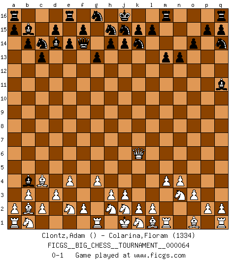 Last move : 0-1 2010 July 2 16:11:15 [Event "FICGS__BIG_CHESS__TOURNAMENT__000064"] [Site "FICGS"] [Date "2010.04.30"] [Round "1"] [White "Clontz,Adam"] [Black "Colarina,Floram"] [Result "0-1"] [WhiteElo ""] [BlackElo "1334"] 1.b2-b3 o15-o14 2.c1-b2 p16-q14 3.p1-o3 n15-n13 4.g2-g4 b15-b14 5.h1-c6 c15-c13 6.e2-e4 c16-b15 7.o3-n5 g15-g13 8.f1-c4 h15-k14 9.o2-o3 e15-e14 10.n2-n4 f16-d14 11.n5-l4 h16-f14 12.c6-k6 b16-c14 13.g1-e2 m15-m13 14.l4-n3 k16-h15 15.m2-m4 l16-o13 16.d2-d3 o16-b4 17.e1-g1 o13-q11 0-1 Follow this game move after move (download)Your body has to be in top condition. Your Chess deteriorates as your body does. You can't separate body from mind. (Bobby Fischer) Ich las kürzlich ein Buch von Nietzsche. Er sagte Religion verdumme nur die Menschen. Ich stimme zu. (Robert James Fischer) Algunos sacrificios son sólidos, los demás son míos. (Mikhail Tal) Toutes choses étant égales, c'est la conviction qui gagne. Alliée à une volonté de vaincre, elle sert de détonateur, suscite des idées, disperse les doutes et aide à penser clairement. (Robert Fischer) Train yourself to let go of everything you fear to lose. (Master Yoda in Star Wars ep.3)
