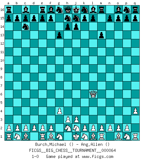 Last move : 1-0 2010 June 12 20:41:25 [Event "FICGS__BIG_CHESS__TOURNAMENT__000064"] [Site "FICGS"] [Date "2010.04.30"] [Round "1"] [White "Burch,Michael"] [Black "Ang,Allen"] [Result "1-0"] [WhiteElo ""] [BlackElo ""] 1.q2-q4 g15-g13 2.g2-g4 m15-m13 3.h1-c6 b16-c14 4.c6-l6 1-0 This big chess game has been lost on time (started : 2010.04.30 14:8:35) Follow this game move after move (download)I still hope to kill Fischer. (Boris Spassky) Über die Verhaftung Bobby Fischers: Warum es die Bush-Administration für nötig befindet einen 61 Jahre alten Mann zu hetzten, der für niemanden ausser sich selbste eine Gefahr darstellt ist ein Rätsel. (Nigel Short) No hay precio que no valga la pena por la cabellera del Rey enemigo. (Koblentz) Un millionnaire : 'Monsieur Steinitz ! Vous ne participez aux tournois que pour l'argent, alors que moi je n'y viens que pour l'honneur.' Steinitz : 'Chacun joue pour ce qu'il n'a pas'... If you are going through hell, keep going. (Winston Churchill)