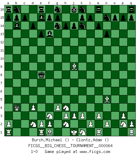 Last move : 1-0 2010 July 2 16:11:25 [Event "FICGS__BIG_CHESS__TOURNAMENT__000064"] [Site "FICGS"] [Date "2010.04.30"] [Round "1"] [White "Burch,Michael"] [Black "Clontz,Adam"] [Result "1-0"] [WhiteElo ""] [BlackElo ""] 1.b2-b4 n15-n13 2.c2-c4 o16-b4 3.c1-b2 m15-m14 4.g2-g4 l16-n14 5.h1-b7 b4-g9 6.b2-j9 d15-d14 7.j2-h4 g9-o2 8.m2-m3 j15-g14 9.l1-o4 h16-q8 10.p2-p3 o2-b14 11.p1-o3 p16-n15 12.o1-p2 e15-e13 13.d2-d4 h15-k14 14.o4-n5 q8-e8 15.k2-k3 n14-c4 16.b7-b4 c4-h9 17.o3-q4 h9-p2 18.q4-p2 c16-f13 19.g1-f3 f16-e15 20.b1-d2 1-0 Follow this game move after move (download)If your opponent offers you a draw, try to work out why he thinks he's worse off. (Nigel Short) Als er Schachweltmeister wurde ließ er praktisch alle stärksten Sovietspieler für sich arbeiten. Wenn ein auch nur mittelmässiger Meister ein Spezialist für eine bestimmte Eröffnung war, wurde er von Karpov gerufen. Das wurde alles geheim gehalten. (Mikhail Moiseyevich Botvinik) El Ajedrez es un cuento de Hadas de las 1001 metidas de pata. (Savielly Tartakower) Nous sommes les pions de la mystérieuse partie d'Echecs jouée par Dieu. Il nous déplace, nous arrête, nous pousse encore, puis nous lance un à un dans la boîte du Néant. Epitaphe sur la tombe de David Janowsky (1868-1927). In God we trust, all others we virus scan. (Anonymous)