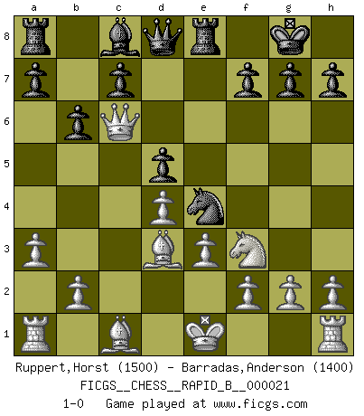 Last move : 1-0 2006 December 15 18:34:45 [Event "FICGS__CHESS__RAPID_B__000021"] [Site "FICGS"] [Date "2006.10.31"] [Round "1"] [White "Ruppert,Horst"] [Black "Barradas,Anderson"] [Result "1-0"] [WhiteElo "1500"] [BlackElo "1400"] 1.d4 Nf6 2.c4 e6 3.Nc3 Bb4 4.Qc2 Nc6 5.Nf3 O-O 6.a3 Bxc3+ 7.Qxc3 d5 8.e3 Ne4 9.Qc2 Re8 10.Bd3 b6 11.cxd5 exd5 12.Qxc6 1-0 This chess game has been lost on time (started : 2006.10.31 23:12:19) Nimzo-Indian : Classical, 4...Nc6 Kingside Castling by player Black (move 5) Player White won this chess game. Follow this game move after move (download)If a ruler does not understand Chess, how can he rule over a kingdom ? (King Khusros II) Kleine Schachspieler machen Mist, und große Schachspieler machen Mist, aber große machen weniger Mist. (Fritz Sämisch) Cuando veas una buena jugada, trata de encontrar otra mejor. (Emanuel Lasker) Dans le domaine de la peinture, de la gravure et de la sculpture, dès la première décennie de notre siècle, les artistes abandonnent la représentation de la partie d'échecs pour se concentrer sur les pièces, sur les échiquiers et sur toutes les variations auxquelles les unes et les autres peuvent donner lieu. On passe en quelque sorte d'un thème social à un thème musical (au sens de la musica médiévale, c'est-à-dire d'une notion qui inclue le rythme, l'harmonie, la construction et la déconstruction, etc.). Graphiquement et picturalement, l'échiquier apparaît comme une structure ouverte, dynamique, d'une richesse infinie, autorisant toutes les combinatoires et débouchant sur des mouvements et des rythmes de nature exponentielle. (Michel Pastoureau) Creativity is inventing, experimenting, growing, taking risks, breaking rules, making mistakes, and having fun. (Mary Lou Cook)