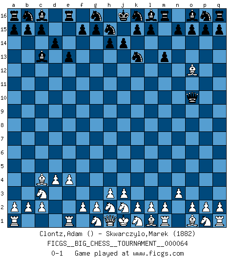 Last move : 0-1 2010 May 4 17:18:58 [Event "FICGS__BIG_CHESS__TOURNAMENT__000064"] [Site "FICGS"] [Date "2010.04.30"] [Round "1"] [White "Clontz,Adam"] [Black "Skwarczylo,Marek"] [Result "0-1"] [WhiteElo ""] [BlackElo "1882"] 1.e2-e4 e15-e13 2.d2-d4 f16-c13 3.n2-n3 d15-d14 4.f1-c4 m15-m13 5.c1-o12 j15-k13 6.b1-c3 h16-o10 0-1 Follow this game move after move (download)Nothing excites jaded Grandmasters more than a theoretical novelty. (Dominic Lawson) Du musst Deinen Gegner in einen tiefen dunklen Wald führen wo 2+2=5 ist und wo der Weg, der wieder hinausführt, nur breit genug für einen ist. (Mikhail Nekhemyevich Tal) Todos los jugadores de Ajedrez deberían tener un pasatiempo. (Savielly Tartakower) Les réformistes prétendent que les progrès de la théorie conduiront à la disparition des échecs, et qu'il faut, pour leur rendre vie, en remanier les règles. En réalité, qu'exprime cette affirmation? Le mépris de l'intuition, de l'imagination et de tous les autres éléments qui font des échecs un art. (Alexander Alekhine) For a mechanic, you seem to do an excessive amount of thinking. (C-3PO in Star Wars ep.2)