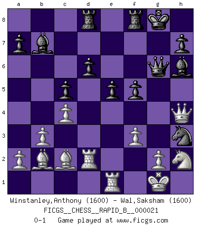 Last move : 0-1 2007 February 12 16:9:10 [Event "FICGS__CHESS__RAPID_B__000021"] [Site "FICGS"] [Date "2006.10.31"] [Round "1"] [White "Winstanley,Anthony"] [Black "Wal,Saksham"] [Result "0-1"] [WhiteElo "1600"] [BlackElo "1600"] 1.e4 c5 2.Nf3 d6 3.d4 cxd4 4.Nxd4 Nc6 5.Nxc6 bxc6 6.Bd3 Nf6 7.b3 g6 8.Bb2 Bg7 9.O-O O-O 10.Nd2 Qc7 11.h3 Bb7 12.Re1 Rad8 13.Nf3 e5 14.c4 c5 15.Nh2 Qd7 16.Qd2 Nh5 17.Bc2 f5 18.exf5 Nf4 19.f3 Bh6 20.Qf2 gxf5 21.Rad1 Qe6 22.Qh4 Qg6 23.Rd2 Nxh3+ 0-1 This chess game has been lost on time (started : 2006.10.31 23:12:19) Sicilian Kingside Castling by player White (move 9) Kingside Castling by player Black (move 9) Player Black won this chess game. Follow this game move after move (download)Life is a kind of Chess, with struggle, competition, good and ill events. (Benjamin Franklin) Im Hotelzimmer gab es nur zwei Schaben. (Über die Turnierbedingungen) (Peter Swidler) Todos los Maestros de Ajedrez fueron un día unos principiantes. (Chernev) Ce n'est pas pour s'amuser qu'il joue aux échecs : il célèbre un culte. (Vladimir Nabokov) At work, the authority of a person is inversely proportional to the number of pens that person is carrying. (Dan Rotaru)