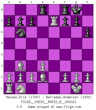 Last move : 1-0 2006 December 18 12:52:58 [Event "FICGS__CHESS__RAPID_B__000021"] [Site "FICGS"] [Date "2006.10.31"] [Round "1"] [White "Hensen,Erik"] [Black "Barradas,Anderson"] [Result "1-0"] [WhiteElo "1700"] [BlackElo "1400"] 1.e4 e5 2.Nf3 Nc6 3.Bc4 Nf6 4.d3 h6 5.O-O d5 6.exd5 Nxd5 7.Re1 Bg4 8.Nxe5 Bxd1 9.Nxc6 Ne7 10.Nxd8 Rxd8 11.Rxd1 Nd5 12.Re1+ Be7 13.Bd2 Nb6 14.Bb3 O-O 15.Rxe7 1-0 This chess game has been lost on time (started : 2006.10.31 23:12:19) Two knights defense (Modern Bishop's Opening) Kingside Castling by player White (move 5) Kingside Castling by player Black (move 14) Player White won this chess game. Follow this game move after move (download)As one by one I mowed them down, my superiority soon became apparent. (Jose Capablanca) Wir irren allesamt, nur jeder irrt anders. (Georg Christoph Lichtenberg) Hay jugadores fuertes y personas amables y yo soy un jugador fuerte. (Bobby Fischer) Le succès, c'est être capable d'aller d'échec en échec sans perdre son enthousiasme. (Winston Churchill) We're missing something. (Gregory House, House M.D.)