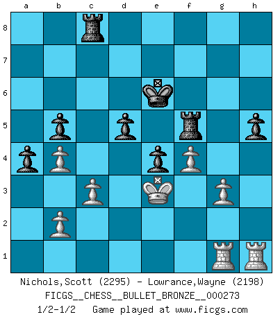 Last move : 1/2-1/2 2010 April 30 22:54:26 [Event "FICGS__CHESS__BULLET_BRONZE__000273"] [Site "FICGS"] [Date "2010.04.30"] [Round "1"] [White "Nichols,Scott"] [Black "Lowrance,Wayne"] [Result "1/2-1/2"] [WhiteElo "2295"] [BlackElo "2198"] 1.e4 c5 2.Nf3 d6 3.d4 cxd4 4.Nxd4 Nf6 5.Nc3 g6 6.Be3 Bg7 7.f3 O-O 8.Qd2 Nc6 9.Bc4 Qc7 10.Bb3 Nxd4 11.Bxd4 Be6 12.O-O-O Rac8 13.Rhe1 Bxb3 14.axb3 Qa5 15.Kb1 Rfd8 16.Nd5 Qxd2 17.Rxd2 Nxd5 18.exd5 Bxd4 19.Rxd4 Re8 20.c3 a5 21.Kc2 b5 22.Ra1 Ra8 23.Re4 e5 24.dxe6 fxe6 25.Kd3 Kf7 26.Rh4 h5 27.Rd4 d5 28.Re1 Reb8 29.Ke3 Kf6 30.Ra1 g5 31.h4 Rg8 32.Kf2 Ke7 33.g3 Kd6 34.hxg5 Rxg5 35.Rh4 e5 36.f4 Rf5 37.Kg2 e4 38.R4h1 a4 39.Kf2 Kc5 40.Ra3 Rb8 41.b4+ Kd6 42.R3a1 Rg8 43.Rh2 Rc8 44.Ke3 Ke6 45.R2h1 Rg8 46.Rag1 Rc8 1/2-1/2 Sicilian : Dragon, Yugoslav attack, 7...O-O Kingside Castling by player Black (move 7) Queenside Castling by player White (move 12) This chess game ended in a draw. Follow this game move after move (download)The way he plays Chess demonstrates a man's whole nature. (Stanley Ellin) Mit Schach schule ich mein Gefühl für Geometrie, was für Tennis und Schach gleichermaßen wichtig ist. (Boris Becker) Estaba muy claro de que el punto vulnerable del Gran Maestro Americano (Bobby Fischer) radicaba en las posiciones de doble filo, colgantes, irracionales, donde el siempre falló en encontrar un triunfo aún en una posición de clara victoria. (Efim Geller) Vous savez, camarade Pachman, je n'éprouve pas de plaisir à être ministre, je jouerais plutôt aux échecs comme vous, ou alors ferais une révolution au Venezuela. (Che Guevara à Ludek Pachman, 'Checkmate in Prague', 1975) Ah, the Socrating method. The best way we have of teaching everything-apart from juggling chainsaws. (Gregory House, House M.D.)