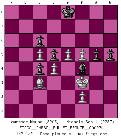 Last move : 1/2-1/2 2010 April 30 23:24:13 [Event "FICGS__CHESS__BULLET_BRONZE__000274"] [Site "FICGS"] [Date "2010.04.30"] [Round "1"] [White "Lowrance,Wayne"] [Black "Nichols,Scott"] [Result "1/2-1/2"] [WhiteElo "2205"] [BlackElo "2287"] 1.e4 e5 2.Nf3 Nc6 3.Bb5 a6 4.Ba4 Nf6 5.O-O Be7 6.Re1 b5 7.Bb3 d6 8.c3 O-O 9.h3 Nb8 10.d4 Nbd7 11.Nbd2 Bb7 12.Bc2 Re8 13.a4 Bf8 14.b3 g6 15.Bd3 c6 16.axb5 axb5 17.Rxa8 Bxa8 18.b4 exd4 19.cxd4 d5 20.e5 Nh5 21.Ba3 Nb6 22.Nb3 Nc4 23.Qc1 Ng7 24.Nc5 Ne6 25.Re2 Nxc5 26.bxc5 Qa5 27.Bb2 Bb7 28.Bc3 Qa3 29.Qxa3 Nxa3 30.Ra2 Ra8 31.Kf1 Kg7 32.Ke2 Be7 33.Bb4 Nc4 34.Rxa8 Bxa8 35.Nd2 f5 36.g4 fxg4 37.hxg4 Bg5 38.Nb3 Bb7 39.Kf3 Bh4 40.Nd2 Bc8 41.Nxc4 bxc4 42.Bc2 Bg5 43.Kg3 Bc1 44.Bc3 g5 45.Bf5 Bxf5 46.gxf5 h5 47.Kg2 Kf7 48.Kf3 Ke8 49.Kg2 Bf4 50.Kf3 1/2-1/2 Ruy Lopez : Closed Kingside Castling by player White (move 5) Kingside Castling by player Black (move 8) This chess game ended in a draw. Follow this game move after move (download)There's never before been a Chess player with such a thorough knowledge of the intricacies of the game and such an absolutely indomitable will to win. I think Bobby is the greatest player that ever lived. (Lisa Lane) Die Neutralität betrachte ich als eine schwere Krankheit. (Viktor Kortschnoi) El arma más poderosa en el Ajedrez, es tener la próxima movida. (David Bronstein) Mais l'homme est une créature légère et illogique : semblable au joueur d'échecs, il n'aime que le processus du but à atteindre, non le but lui-même. (Dostoïevsky) Hold em is to stud what chess is to checkers. (Johnny Moss)