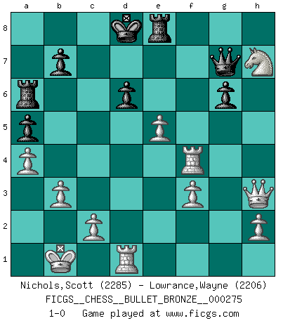Last move : 1-0 2010 April 30 23:51:8 [Event "FICGS__CHESS__BULLET_BRONZE__000275"] [Site "FICGS"] [Date "2010.04.30"] [Round "1"] [White "Nichols,Scott"] [Black "Lowrance,Wayne"] [Result "1-0"] [WhiteElo "2285"] [BlackElo "2206"] 1.e4 c5 2.Nf3 d6 3.d4 cxd4 4.Nxd4 Nf6 5.Nc3 g6 6.Be3 Bg7 7.f3 Nc6 8.Qd2 O-O 9.O-O-O Qa5 10.Kb1 Rd8 11.Nb3 Qc7 12.g4 Be6 13.g5 Nh5 14.Be2 a5 15.Bb5 Ne5 16.Nd4 Nc4 17.Bxc4 Bxc4 18.b3 Be6 19.a4 Qd7 20.Ncb5 Bh6 21.gxh6 Bh3 22.Rhg1 Ra6 23.Qf2 e5 24.Qh4 exd4 25.Bxd4 Kf8 26.Be5 Qe7 27.Bg7+ Ke8 28.Qxh3 f6 29.Nc3 Nxg7 30.Nd5 Qf7 31.hxg7 Qxg7 32.Rg4 Rd7 33.Rf4 Kd8 34.Nxf6 Re7 35.Nxh7 Re8 36.e5 1-0 Sicilian : Dragon, Yugoslav attack Kingside Castling by player Black (move 8) Queenside Castling by player White (move 9) Player White won this chess game. Follow this game move after move (download)Chess is life. (Bobby Fischer) Im Spitzenschach von heute geht es nur um Vorbereitung, um tiefgründige, sorgfältige Eröffnungsvorbereitung. (Nigel Short) El Ajedrez tiene tanto misterio como las mujeres. (Purdy) Shah mat. Le roi est mort. Cri de fierté d'un joueur venant de terrasser son adversaire, courtoisement, sans effusion de sang. Now be brave and don't look back. Don't look back. (Shmi Skywalker in Star Wars ep.1)