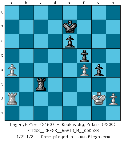 Last move : 1/2-1/2 2010 June 4 20:2:50 [Event "FICGS__CHESS__RAPID_M__000028"] [Site "FICGS"] [Date "2010.05.01"] [Round "1"] [White "Unger,Peter"] [Black "Krakovsky,Peter"] [Result "1/2-1/2"] [WhiteElo "2160"] [BlackElo "2200"] 1.d4 d5 2.Nf3 c6 3.c4 Nf6 4.Nc3 e6 5.e3 Nbd7 6.Bd3 dxc4 7.Bxc4 b5 8.Bd3 a6 9.e4 c5 10.e5 cxd4 11.Nxb5 axb5 12.exf6 gxf6 13.O-O Qb6 14.Qe2 b4 15.Rd1 Bc5 16.a4 bxa3 17.bxa3 Bb7 18.Rb1 Qc6 19.Bb5 Qd5 20.Be3 Rg8 21.Kf1 Kf8 22.Bc4 Qc6 23.Bxd4 Bxd4 24.Rxd4 Ne5 25.Qd2 Ba6 26.Qb4+ Ke8 27.Bxa6 Qxa6+ 28.Qb5+ Qxb5+ 29.Rxb5 Nxf3 30.gxf3 Rg5 31.Rxg5 fxg5 32.a4 Ke7 33.f4 h6 34.Ke2 g4 35.f3 h5 36.Kf2 f5 37.fxg4 hxg4 38.Kg2 Rc8 39.Rd2 Rc3 40.Ra2 1/2-1/2 Queen's pawn game Kingside Castling by player White (move 13) 10 pieces endgame at move 37 : White KRPPP , Black KRPPP WHITE : King + 1 Rook 3 Pawns BLACK : King + 1 Rook 3 Pawns This chess game ended in a draw. Follow this game move after move (download)After a bad opening, there is hope for the middle game. After a bad middle game, there is hope for the endgame. But once you are in the endgame, the moment of truth has arrived. (Edmar Mednis) Die westlichen Werte sind eine Sprache, welche die Putin-Administration nicht versteht. (Garry Kasparov) En el Ajedrez, tal como en la vida, las bendiciones de hoy pueden ser el veneno del mañana. (Assaic) Mais n'est-ce pas déjà le limiter injurieusement que d'appeler les échecs un jeu? N'est-ce pas aussi une science, un art, ou quelque chose qui, comme le cercueil de Mahomet entre ciel et terre, est suspendu entre l'un et l'autre, et qui réunit un nombre incroyable de contraires ? (Stefan Zweig) I know the human being and fish can coexist peacefully. (George W. Bush, Saginaw sept. 29, 2000)
