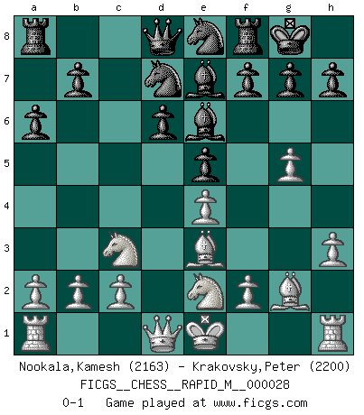 Last move : 0-1 2010 May 12 19:9:3 [Event "FICGS__CHESS__RAPID_M__000028"] [Site "FICGS"] [Date "2010.05.01"] [Round "1"] [White "Nookala,Kamesh"] [Black "Krakovsky,Peter"] [Result "0-1"] [WhiteElo "2163"] [BlackElo "2200"] 1.e4 c5 2.Nf3 d6 3.d4 cxd4 4.Nxd4 Nf6 5.Nc3 a6 6.h3 e5 7.Nde2 Be6 8.g4 Be7 9.Bg2 O-O 10.Be3 Nbd7 11.g5 Ne8 0-1 Sicilian : Najdorf, Adams attack Kingside Castling by player Black (move 9) Player Black won this chess game. Follow this game move after move (download)Chess is a terrific way for kids to build self image and self esteem. (Saudin Robovic) Wir können eben der zündenden Macht des Opfers nicht wiederstehen, denn die Begeisterung für das Opfer liegt in der Natur des Menschen. (Rudolf Spielmann) Me gusta decir que Bobby Fischer fue el mejor jugador que jamás haya existido. Pero lo que hizo de Fischer un genio, fue su habilidad de mezclar una frescura y pragmatismo Americano con ideas Rusas acerca de la estrategia. (Bruce Pandolfini) Aux échecs, les retours au sommet sont rares : les dommages psychologiques consécutifs à une défaite sont trop sévères. (Daily Telegraph) Chess, like love, like music, has the power to make people happy. (Siegbert Tarrasch)