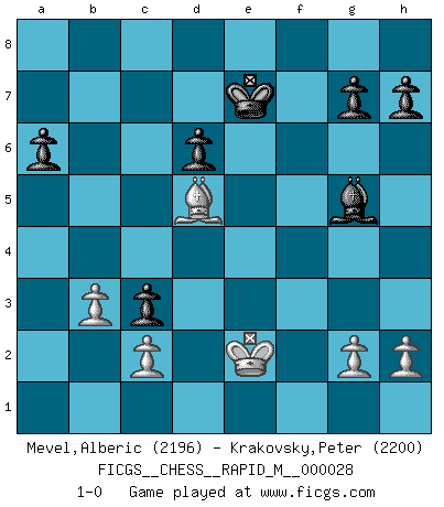 Last move : 1-0 2010 August 30 22:52:13 [Event "FICGS__CHESS__RAPID_M__000028"] [Site "FICGS"] [Date "2010.05.01"] [Round "1"] [White "Mevel,Alberic"] [Black "Krakovsky,Peter"] [Result "1-0"] [WhiteElo "2196"] [BlackElo "2200"] 1.e4 c5 2.Nf3 d6 3.d4 cxd4 4.Nxd4 Nf6 5.Nc3 a6 6.Bg5 e6 7.f4 Qb6 8.Qd2 Qxb2 9.Rb1 Qa3 10.f5 Nc6 11.fxe6 fxe6 12.Nxc6 bxc6 13.Be2 Be7 14.O-O O-O 15.Rb3 Qc5+ 16.Kh1 Rf7 17.Be3 Qa5 18.Bb6 Qe5 19.Bd4 Nxe4 20.Qe3 Rxf1+ 21.Bxf1 Qf5 22.Bd3 e5 23.Qxe4 Qxe4 24.Bxe4 exd4 25.Bxc6 Be6 26.Bxa8 Bxb3 27.axb3 dxc3 28.Bd5+ Kf8 29.Kg1 Bg5 30.Kf2 Ke7 31.Ke2 1-0 This chess game has been lost on time (started : 2010.05.01 15:32:44) Sicilian : Najdorf, 7...Qb6 Kingside Castling by player White (move 14) Kingside Castling by player Black (move 14) Player White won this chess game. Follow this game move after move (download)A Chess game is divided into three stages: the first, when you hope you have the advantage, the second when you believe you have an advantage, and the third... when you know you're going to lose ! (Savielly Tartakower) Konzentriere dich auf materielle Gewinne. Nimm, was dir dein Gegner gibt, ausser es gibt einen guten Grund der dagegenspricht. (Robert James Fischer) Yo adoro todas la posiciones. Denme una partida posicional difícil, y la jugaré. Pero posiciones totalmente ganadas, no las tolero. (Hein Donner) La guerre est enfant de la passion, la passion est enfant du narcissisme et le narcissisme est l'enfant. (...) Une autre partie ? (Thibault de Vassal) Perception is reality. (Immanuel Kant)