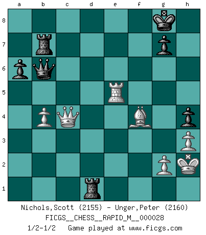 Last move : 1/2-1/2 2010 May 6 23:56:52 [Event "FICGS__CHESS__RAPID_M__000028"] [Site "FICGS"] [Date "2010.05.01"] [Round "1"] [White "Nichols,Scott"] [Black "Unger,Peter"] [Result "1/2-1/2"] [WhiteElo "2155"] [BlackElo "2160"] 1.e4 c5 2.Nf3 d6 3.d4 cxd4 4.Nxd4 Nf6 5.Nc3 a6 6.Be3 e5 7.Nb3 Be6 8.f3 h5 9.Be2 Nbd7 10.Qd2 Be7 11.a4 Nb6 12.a5 Nc4 13.Bxc4 Bxc4 14.Na4 Nd7 15.Nb6 Nxb6 16.axb6 Qc8 17.Na5 O-O 18.b3 Be6 19.O-O Rb8 20.Rad1 f5 21.c4 Bf7 22.Qc2 fxe4 23.fxe4 Rd8 24.b4 Bg6 25.c5 d5 26.Rxd5 Rxd5 27.Qc4 Bxe4 28.Qxe4 Qe6 29.h3 Rd7 30.Rf5 h4 31.Nxb7 R8xb7 32.Rxe5 Rd1+ 33.Kh2 Bd6 34.cxd6 Qxd6 35.Bf4 Qxb6 36.Qc4+ 1/2-1/2 Sicilian : Najdorf, Byrne (English) attack Kingside Castling by player Black (move 17) Kingside Castling by player White (move 19) This chess game ended in a draw. Follow this game move after move (download)The essence of Chess is thinking about what Chess is. (David Bronstein) Besser ein falscher Plan, logisch durchgeführt, als gar kein Plan. (Viktor Kortschnoi) Diferente gente reacciona diferentemente en aceptar la derrota. (Bobby Fischer) Avant la finale, les dieux ont créé le milieu de partie. (Tarrasch) Good luck. You're gonna need it. (Han Solo in Star Wars ep.6)