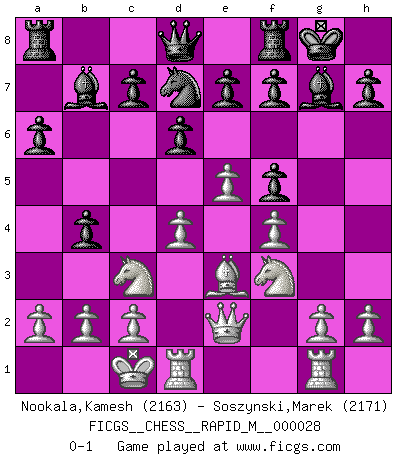 Last move : 0-1 2010 May 12 19:9:34 [Event "FICGS__CHESS__RAPID_M__000028"] [Site "FICGS"] [Date "2010.05.01"] [Round "1"] [White "Nookala,Kamesh"] [Black "Soszynski,Marek"] [Result "0-1"] [WhiteElo "2163"] [BlackElo "2171"] 1.e4 g6 2.d4 Bg7 3.Nc3 d6 4.Be3 a6 5.f4 b5 6.Bd3 Bb7 7.Nf3 Nd7 8.e5 Nh6 9.Qe2 O-O 10.O-O-O Nf5 11.Bxf5 gxf5 12.Rhg1 b4 0-1 Robatsch (Modern) defense Kingside Castling by player Black (move 9) Queenside Castling by player White (move 10) Player Black won this chess game. Follow this game move after move (download)War is the child of passion, passion is the child of narcissism and narcissism is the child. (...) Another game ? (Thibault de Vassal) Ich erzeugte keinen Neid, da mich die Schachspieler als Musiker und die Musiker als Schachspieler betrachteten. (Mark Taimanov) Realmente no sabemos como el juego fue inventado, aunque hay sospechas. Tan pronto como descubramos a los culpables, se los haremos saber. (Bruce Pandolfini) La vie est comme un jeu d'échecs : nous esquissons un plan, mais celui-ci est tributaire de ce que daignent faire l'adversaire aux échecs et le destin dans la vie. (Arthur Schopenhauer) First of all, we have to go back to the classical time control. (Anatoly Karpov)