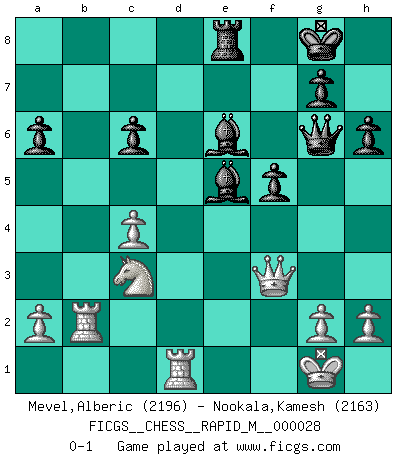 Last move : 0-1 2010 August 9 18:4:26 [Event "FICGS__CHESS__RAPID_M__000028"] [Site "FICGS"] [Date "2010.05.01"] [Round "1"] [White "Mevel,Alberic"] [Black "Nookala,Kamesh"] [Result "0-1"] [WhiteElo "2196"] [BlackElo "2163"] 1.e4 c5 2.Nf3 d6 3.d4 cxd4 4.Nxd4 Nf6 5.Nc3 a6 6.Bg5 e6 7.f4 Qb6 8.Qd3 Qxb2 9.Rb1 Qa3 10.f5 Nc6 11.fxe6 fxe6 12.Nxc6 bxc6 13.Be2 Qa5 14.Bd2 Qd8 15.Qg3 Ra7 16.O-O Rf7 17.Be3 Be7 18.Bb6 Qd7 19.e5 dxe5 20.Rfd1 Nd5 21.Ne4 O-O 22.c4 Nf4 23.Qe3 Qe8 24.Bg4 Rf5 25.Rb2 h6 26.Bc7 Qg6 27.Bxf5 exf5 28.Nc3 Bf6 29.Bxe5 Re8 30.Qxf4 Bxe5 31.Qf3 Be6 0-1 Sicilian : Najdorf, 7...Qb6 Kingside Castling by player White (move 16) Kingside Castling by player Black (move 21) Player Black won this chess game. Follow this game move after move (download)I look one move ahead... the best ! (Siegbert Tarrasch) Alles was ich jemals tun will ist Schach spielen. (Robert James Fischer) Las ideas audaces son como las piezas del Ajedrez que avanzan hacia adelante. Ellas pueden ser vencidas, pero también pueden iniciar una partida victoriosa. (Goethe) Aidez vos pièces, elles vous aideront. (Paul Morphy) Sometimes it pays to stay in bed in Monday, rather than spending the rest of the week debugging Monday's code. (Dan Salomon)