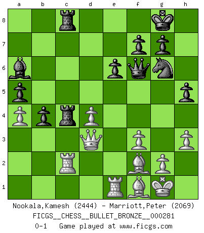 Last move : 0-1 2010 May 2 8:42:57 [Event "FICGS__CHESS__BULLET_BRONZE__000281"] [Site "FICGS"] [Date "2010.05.02"] [Round "1"] [White "Nookala,Kamesh"] [Black "Marriott,Peter"] [Result "0-1"] [WhiteElo "2444"] [BlackElo "2069"] 1.d4 Nf6 2.Nf3 d5 3.c4 dxc4 4.Nc3 a6 5.e3 b5 6.a4 b4 7.Nb1 Bb7 8.Bxc4 e6 9.O-O c5 10.Nbd2 Nbd7 11.b3 cxd4 12.exd4 Bd6 13.Bd3 Nb6 14.Nc4 Nxc4 15.bxc4 O-O 16.Qe2 a5 17.Ne5 Bxe5 18.Qxe5 Qb8 19.Qe2 Qd6 20.Rd1 h6 21.Be3 Rfc8 22.f3 Ba6 23.Qa2 Rc6 24.Rd2 Rb8 25.Bf2 Qd8 26.Qb3 Rbc8 27.Rc2 Nh5 28.Bf1 Nf4 29.Rac1 Ng6 30.Rd1 Qf6 31.Re1 h5 32.h3 R6c7 33.Qd3 Rxc4 0-1 Queen's pawn game Kingside Castling by player White (move 9) Kingside Castling by player Black (move 15) Player Black won this chess game. Follow this game move after move (download)A big shock; the best chess player in history has passed away. (Lajos Portisch, about Bobby Fischer's death) Ich moechte nie einem Club beitreten, der Leute wie mich als Mitglieder aufnimmt. (Woody Allen) Una clavada es mas poderosa que una espada. (Fred Reinfeld) Toutes les manuvres exécutées sur une colonne ouverte ont pour but ultime l'intrusion définitive sur la septième ou la huitième rangée, en plein cur de la position ennemie. (Aaron Nimzovitch) Fame, I have already. Now I need the money. (an elderly Steinitz)
