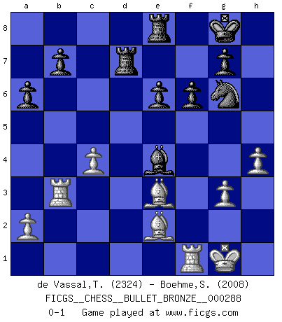 Last move : 0-1 2010 May 3 19:29:34 [Event "FICGS__CHESS__BULLET_BRONZE__000288"] [Site "FICGS"] [Date "2010.05.03"] [Round "1"] [White "de Vassal,Thibault"] [Black "Boehme,Sebastian"] [Result "0-1"] [WhiteElo "2324"] [BlackElo "2008"] 1.e4 c5 2.Nf3 d6 3.d4 cxd4 4.Nxd4 Nf6 5.Nc3 a6 6.Bg5 e6 7.f4 Qb6 8.Qd2 Qxb2 9.Rb1 Qa3 10.e5 dxe5 11.fxe5 h6 12.Bh4 Nfd7 13.Be2 Be7 14.Bg3 Bg5 15.Qd3 Nc5 16.Qf3 Bd7 17.O-O O-O 18.Bf2 Nc6 19.Nb3 Nxb3 20.Rxb3 Qa5 21.Ne4 Nxe5 22.Qg3 Ng6 23.Nxg5 hxg5 24.Be3 Bc6 25.Qxg5 Qxg5 26.Bxg5 f6 27.Be3 Rfd8 28.c4 Rd7 29.g3 Re8 30.h4 Be4 0-1 Sicilian : Najdorf, 7...Qb6 Kingside Castling by player White (move 17) Kingside Castling by player Black (move 17) Player Black won this chess game. Follow this game move after move (download)If your opponent offers you a draw, try to work out why he thinks he's worse off. (Nigel Short) Nach Morphy wurde nichts neues mehr in der Behandlung offener Positionen gefunden. (Mikhail Moiseyevich Botvinik) Aún el Rey más flojo huye despavorido ante la amenaza de un Jaque doble. (Aaron Nimzowitsch) Nous sommes les pions de la mystérieuse partie d'Echecs jouée par Dieu. Il nous déplace, nous arrête, nous pousse encore, puis nous lance un à un dans la boîte du Néant. Epitaphe sur la tombe de David Janowsky (1868-1927). Treat your password like your toothbrush. Don't let anybody else use it, and get a new one every six months. (Clifford Stoll)