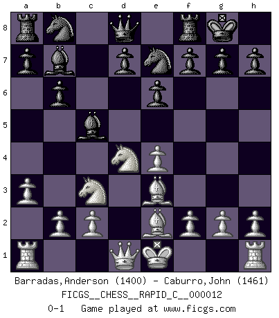 Last move : 0-1 2006 December 12 18:11:13 [Event "FICGS__CHESS__RAPID_C__000012"] [Site "FICGS"] [Date "2006.11.01"] [Round "1"] [White "Barradas,Anderson"] [Black "Caburro,John"] [Result "0-1"] [WhiteElo "1400"] [BlackElo "1461"] 1.e4 b6 2.d4 Bb7 3.Nc3 e6 4.a3 c5 5.Nf3 cxd4 6.Nxd4 Bc5 7.Be3 Ne7 8.Be2 O-O 0-1 This chess game has been lost on time (started : 2006.11.01 12:28:28) Owen defense Kingside Castling by player Black (move 8) Player Black won this chess game. Follow this game move after move (download)All Chess players should have a hobby. (Savielly Tartakower) Wenn sie aufgeben, dann danke ich Ihnen für das Spiel (Eventualzug beim Fernschach). (Anonymous) Diferente gente reacciona diferentemente en aceptar la derrota. (Bobby Fischer) La conception d'un plan est le processus par lequel un joueur exploite les avantages de sa position tout en s'efforçant d'en réduire au minimum les inconvénients. Afin de garantir le succès, un plan doit toujours se fonder sur un diagnostic objectif des particularités d'une position. La conception d'un plan est d'autant plus difficile que la position est équilibrée, et grandement facilitée lorsqu'il n'existe qu'un seul plan susceptible de répondre aux exigences de la position. (Harry Golombek) They misunderestimated me. (George W. Bush, Bentonville nov. 6, 2000)