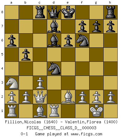 Last move : 0-1 2006 August 12 17:30:22 [Event "FICGS__CHESS__CLASS_D__000003"] [Site "FICGS"] [Date "2006.04.26"] [Round "1"] [White "Fillion,Nicolas"] [Black "Valentin,Florea"] [Result "0-1"] [WhiteElo "1640"] [BlackElo "1400"] 1.e4 c5 2.Na3 Nc6 3.Bb5 e6 4.c3 d5 5.Qe2 dxe4 6.Qxe4 Bd7 7.Nf3 Nf6 8.Qc2 a6 9.Be2 b5 10.O-O Bd6 11.d4 cxd4 12.Rd1 Rc8 13.Nxd4 Nxd4 0-1 This chess game has been lost on time (started : 2006.04.26 12:13:16) Sicilian defense Kingside Castling by player White (move 10) Player Black won this chess game. Follow this game move after move (download)Via the squares on the chessboard, the Indians explain the movement of time and the age, the higher influences which control the world and the ties which link Chess with the human soul. (Al-Masudi) Der Knackpunkt bei der Konzentration ist, daß wir nur durch sie etwas Neues und Ungewöhnliches am Schachbrett finden können. Sie ist der einzige Weg durch neue neue Ideen eine Überraschung zu bereiten. (Garry Kasparov) Una compensación adecuada por un sacrificio es tener una combinación sólida que conduce a una posición ganadora; una compensación adecuada por una metida de pata es dejar a tu oponente arrebatar una derrota de las fauces de la victoria. (Bruce A. Moon) La tactique est l'élément le plus important du milieu de jeu. (Siegbert Tarrasch) Ah, beer! The cause of, and the solution to, all of life's problems. (Homer Simpson)