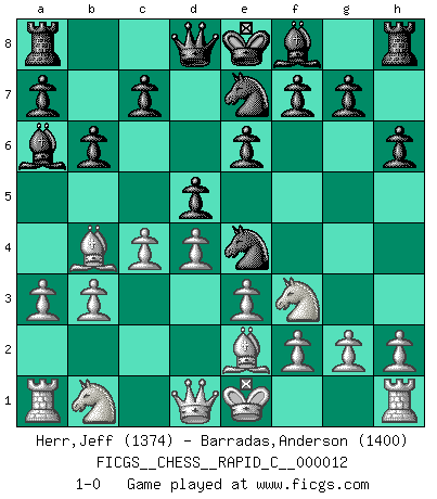 Last move : 1-0 2006 December 16 0:35:12 [Event "FICGS__CHESS__RAPID_C__000012"] [Site "FICGS"] [Date "2006.11.01"] [Round "1"] [White "Herr,Jeff"] [Black "Barradas,Anderson"] [Result "1-0"] [WhiteElo "1374"] [BlackElo "1400"] 1.d4 Nf6 2.c4 e6 3.Bg5 h6 4.Bd2 b6 5.a3 Nc6 6.Nf3 d5 7.e3 Ba6 8.b3 Ne7 9.Be2 Ne4 10.Bb4 1-0 This chess game has been lost on time (started : 2006.11.01 12:28:28) Neo-Indian (Seirawan) attack Player White won this chess game. Follow this game move after move (download)When you don't know what to play, wait for an idea to come into your opponent's mind. You may be sure that idea will be wrong. (Siegbert Tarrasch) Zeige mir drei Eröffnungsvarianten und ich beweise dir, dass zwei davon inkorrekt sind. (Emanuel Lasker) Debió haber existido una vez en que los hombres eran semidióses, de otra manera no hubiesen podido inventar el Ajedrez. (Gustav Schenk) La vie et les Echecs sont tous les deux une lutte constante. (Lasker) Men should grow up. - Yeah. And dogs should stop licking themselves. It's not gonna happen. (Gregory House to Dr. Cameron, House M.D.)