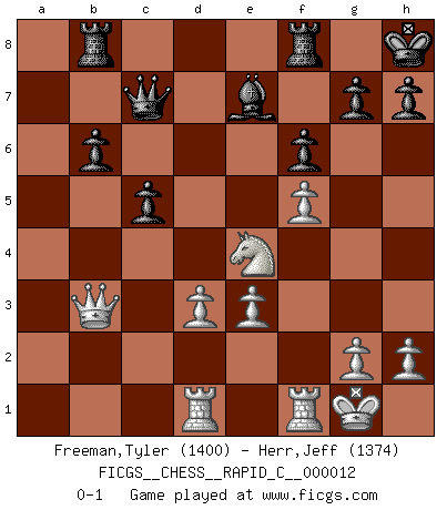 Last move : 0-1 2006 December 31 15:16:4 [Event "FICGS__CHESS__RAPID_C__000012"] [Site "FICGS"] [Date "2006.11.01"] [Round "1"] [White "Freeman,Tyler"] [Black "Herr,Jeff"] [Result "0-1"] [WhiteElo "1400"] [BlackElo "1374"] 1.e4 e5 2.Nf3 Nc6 3.d4 exd4 4.Nxd4 Be7 5.Be3 Nf6 6.Nc3 O-O 7.Bd3 Ne5 8.a4 d6 9.b4 Nxd3+ 10.cxd3 c5 11.bxc5 dxc5 12.Nf5 b6 13.O-O Bxf5 14.exf5 Nd5 15.Ne4 f6 16.a5 Kh8 17.axb6 axb6 18.Qb3 Rb8 19.Rad1 Nxe3 20.fxe3 Qc7 0-1 This chess game has been lost on time (started : 2006.11.01 12:28:28) Scotch game Kingside Castling by player Black (move 6) Kingside Castling by player White (move 13) Player Black won this chess game. Follow this game move after move (download)During a Chess competition a Chessmaster should be a combination of a beast of prey and a monk. (Alexander Alekhine) Ich glaube, ich kenne inzwischen die Gründe für mein Versagen: schachliche Charakterfehler. Ich war nie ein Wunderkind und in meiner gesamten menschlichen Entwicklung immer zu langsam. (Viktor Kortschnoi) El Ajedrez es de 30 a 40 por ciento psicología. Uno no cuenta con esto cuando se juega contra una computadora. No lo puedo confundir. (Judith Polgar) Les Echecs représentent une sphère d'idées créatrices basée sur la volonté des deux protagonistes. (Smyslov) Never was anything great achieved without danger. (Niccolo Machiavelli)