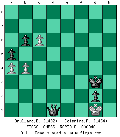 Last move : 0-1 2010 August 26 2:47:47 [Event "FICGS__CHESS__RAPID_D__000040"] [Site "FICGS"] [Date "2010.05.05"] [Round "1"] [White "Brulland,Emmanuel"] [Black "Colarina,Floram"] [Result "0-1"] [WhiteElo "1432"] [BlackElo "1454"] 1.b3 b6 2.g3 Bb7 3.Nf3 Nf6 4.Bg2 e6 5.Bb2 Be7 6.O-O O-O 7.d3 d6 8.Nbd2 c5 9.e4 Nbd7 10.Nc4 d5 11.exd5 Bxd5 12.Ne3 Bb7 13.a3 Ne8 14.Nc4 Bf6 15.Bxf6 Ndxf6 16.Re1 Nd6 17.Nxd6 Qxd6 18.Qd2 Rad8 19.Ne5 Bxg2 20.Kxg2 Nd7 21.Nxd7 Rxd7 22.Qe3 h6 23.a4 Qd5+ 24.Qe4 Qxe4+ 25.Rxe4 a5 26.Rae1 Rfd8 27.Kf3 Rd4 28.Rxd4 Rxd4 29.Re4 Rd5 30.h4 Kf8 31.Ke3 Ke7 32.f4 Kf6 33.g4 g5 34.fxg5+ hxg5 35.h5 Rd6 36.c4 Kg7 37.Re5 f6 38.Re4 f5 39.gxf5 exf5 40.Re5 Kf6 41.Rd5 Re6+ 42.Kf2 g4 43.h6 Kg6 44.h7 Kxh7 45.Rxf5 Kg6 46.Rf8 Rf6+ 47.Rxf6+ Kxf6 48.Kg2 Kf5 49.Kg3 Kg5 50.Kg2 Kf4 51.Kf2 g3+ 52.Kg2 Kg4 53.Kg1 Kf3 54.Kf1 g2+ 55.Kg1 Kg3 56.d4 cxd4 57.b4 d3 58.c5 d2 59.c6 d1Q+ 0-1 Nimzovich-Larsen attack : Symmetrical variation Kingside Castling by player White (move 6) Kingside Castling by player Black (move 6) 10 pieces endgame at move 47 : White KPPPP , Black KPPPP WHITE : King + 4 Pawns BLACK : King + 4 Pawns 9 pieces endgame at move 56 : White KPPP , Black KPPPP WHITE : King + 3 Pawns BLACK : King + 4 Pawns Promotion Queen by player Black (move 59) Player Black won this chess game. Follow this game move after move (download)Any material change in a position must come about by mate, a capture, or a Pawn promotion. (Purdy) Wenn ich einen Club besuche, sind die Spieler stumm vor Staunen. (José Raúl Capablanca) Combinaciones deslumbrantes son para la mayoría, mover madera es para los pocos. (Georg Kieninger) D'abord les bases : Jouez et étudiez, puis étudiez et jouez, ensuite jouez et étudiez, puis étudiez et jouez. Deuxièmement : Donnez toujours le meilleur de vous-même ! (Ken Smith) Methinks King Thibault should dub Marius Zubac a knight of the square board... I mean table, henceforth addressing him as Sir Marius, and bestow on him a suitable land from the kingdom of FICGS & marry him off to a worthy, fair maiden, lest he slice our heads with his mighty sword in his wrath. (Dinesh De Silva)