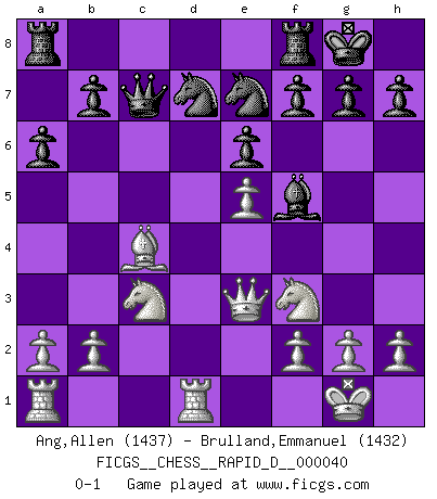 Last move : 0-1 2010 June 21 20:57:9 [Event "FICGS__CHESS__RAPID_D__000040"] [Site "FICGS"] [Date "2010.05.05"] [Round "1"] [White "Ang,Allen"] [Black "Brulland,Emmanuel"] [Result "0-1"] [WhiteElo "1437"] [BlackElo "1432"] 1.e4 c6 2.d4 d5 3.e5 Bf5 4.Nf3 e6 5.Be2 a6 6.O-O c5 7.Be3 Nd7 8.c4 dxc4 9.Bxc4 cxd4 10.Qxd4 Bc5 11.Qf4 Bxe3 12.Qxe3 Ne7 13.Nc3 O-O 14.Rfd1 Qc7 0-1 This chess game has been lost on time (started : 2010.05.05 12:3:33) Caro-Kann : Advance variation Kingside Castling by player White (move 6) Kingside Castling by player Black (move 13) Player Black won this chess game. Follow this game move after move (download)Nonsense was the last thing Fischer was interested in, as far as Chess was concerned. (Elie Agur) Was ist der Unterschied zwischen einem Strassenarbeiter und einem Schachspieler? --Der Schachspieler bewegt sich ab und zu. (Anonymous) Dios mío, Bobby Fischer juega tan simple. (Alexei Suetin) C'est la seule position que je connaisse où les deux camps sont mals. Propos prêtés à V. Anand. CHESS, n. f. [echecs, Fr.] A nice and abstruse game, in which two sets of puppets are moved in opposition to each other. (Dr Samuel Johnson, A Dictionary Of The English Language, 1755)