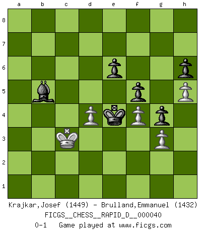 Last move : 0-1 2010 June 22 7:28:34 [Event "FICGS__CHESS__RAPID_D__000040"] [Site "FICGS"] [Date "2010.05.05"] [Round "1"] [White "Krajkar,Josef"] [Black "Brulland,Emmanuel"] [Result "0-1"] [WhiteElo "1449"] [BlackElo "1432"] 1.e4 c6 2.Nc3 d5 3.d4 e6 4.Nf3 Nd7 5.Bf4 Ngf6 6.Qd3 dxe4 7.Nxe4 Nxe4 8.Qxe4 Nf6 9.Qd3 Be7 10.Ne5 O-O 11.Be2 Re8 12.O-O-O Bf8 13.Qg3 g6 14.h4 Nd5 15.h5 Nxf4 16.Qxf4 Qe7 17.a3 g5 18.Qg4 h6 19.Bd3 f5 20.Qe2 Bg7 21.g3 Bxe5 22.Qxe5 Qg7 23.Qd6 Qe7 24.Qxe7 Rxe7 25.f4 g4 26.b4 a5 27.bxa5 Rxa5 28.Rhe1 Kf7 29.Re5 Rxa3 30.Kb2 Ra4 31.c3 b5 32.Rc5 Bd7 33.Kb3 Re8 34.c4 Ra5 35.Re1 Kf6 36.cxb5 cxb5 37.Rc7 Re7 38.Re5 Ra1 39.Bxb5 Rb1+ 40.Kc2 Rxb5 41.Rxb5 Bxb5 42.Rxe7 Kxe7 43.Kb3 Kd6 44.Kb4 Kc6 45.Kb3 Kd5 46.Kc3 Ke4 0-1 Caro-Kann defense Kingside Castling by player Black (move 10) Queenside Castling by player White (move 12) Player Black won this chess game. Follow this game move after move (download)I feel as if I were a piece in a game of Chess, when my opponent says of it: That piece cannot be moved. (Soren Kierkegaard) Wer nie einen Fehler gemacht hat, hat nie etwas Neues ausprobiert. (Albert Einstein) Las Aperturas te enseñan aperturas. ¡Los Finales te enseñan Ajedrez!. (Stephan Gerzadowicz) Les échecs sont un jeu par leur forme, un art par leur essence et une science par sa difficulté d'acquisition. Ils peuvent vous procurer autant de plaisir qu'un bon livre ou une belle musique, mais vous n'aurez une réelle joie que si vous arrivez à bien jouer. (Tigran Petrosian) When you have everything, sometimes it feels like nothing. (Horatio Caine, C.S.I. Miami)