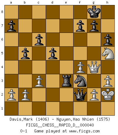 Last move : 0-1 2010 June 3 15:28:8 [Event "FICGS__CHESS__RAPID_D__000040"] [Site "FICGS"] [Date "2010.05.05"] [Round "1"] [White "Davis,Mark"] [Black "Nguyen,Hao Nhien"] [Result "0-1"] [WhiteElo "1406"] [BlackElo "1575"] 1.e4 e6 2.Nf3 d5 3.exd5 exd5 4.d4 Nf6 5.Nc3 Bd6 6.Bb5+ c6 7.Be2 O-O 8.Bg5 Re8 9.O-O h6 10.Bh4 Bf5 11.Re1 Nbd7 12.Rc1 Qc7 13.Bxf6 Nxf6 14.h3 Re7 15.Bf1 Ne4 16.Bd3 Rae8 17.Ne2 b5 18.Ne5 Bxe5 19.dxe5 Rxe5 20.f3 Nd6 21.Bxf5 Nxf5 22.c3 Qb6+ 23.Kh2 Qf2 24.Rc2 Ne3 25.Ng3 Nxc2 26.Rxe5 Rxe5 27.f4 Re3 28.Qg4 Ne1 29.Nh5 Nf3+ 0-1 French defense Kingside Castling by player Black (move 7) Kingside Castling by player White (move 9) Player Black won this chess game. Follow this game move after move (download)It is no time to be playing Chess when the house is on fire. (Italian Proverb) Charakterschwächen offenbaren sich normalerweise während einer Schachpartie. (Garry Kasparov) El Ajedrez no es una pizca de inferior al violín, y tenemos un gran número de violinistas profesionales. (Mikhail Botvinnik) Les Echecs, c'est l'art de la guerre sans les charniers, c'est la résurrection des morts tombés au champ d'honneur, l'espoir perpétuel, la suprématie de l'intelligence sur la force, la culture de l'esprit. (F. Szpiner) The next best thing to gambling and winning is gambling and loosing. (Nick Dandalos)