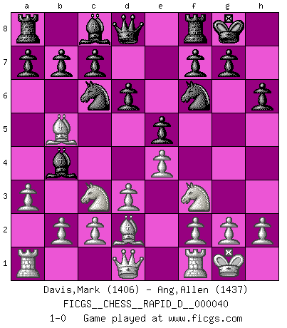 Last move : 1-0 2010 June 17 8:47:46 [Event "FICGS__CHESS__RAPID_D__000040"] [Site "FICGS"] [Date "2010.05.05"] [Round "1"] [White "Davis,Mark"] [Black "Ang,Allen"] [Result "1-0"] [WhiteElo "1406"] [BlackElo "1437"] 1.e4 e5 2.Nf3 Nc6 3.Nc3 Nf6 4.Bb5 Bb4 5.d3 d6 6.Bd2 O-O 7.O-O h6 8.a3 1-0 This chess game has been lost on time (started : 2010.05.05 12:3:33) Four knights : double Ruy Lopez Kingside Castling by player Black (move 6) Kingside Castling by player White (move 7) Player White won this chess game. Follow this game move after move (download)Chess is a sea in which a gnat may drink and an elephant may bathe. (Hindu proverb) Über Frauen: Chess is better. (Robert James Fischer) Personalmente, yo prefiero mirar hacia el futuro en donde un programa de computadora gane el título mundial de Ajedrez. La humanidad necesita una lección de humildad. (Richard Dawkings) Il n'y a plus de joueurs du niveau de Jacob Murray dont la seule quête est le beau jeu, le plaisir de voir les pièces construire quelque chose. Sur 10 idées à la minute, 9 seront sans intérêt, la dernière s'avèrera géniale. (Christian Bauer) Men never do evil so completely and cheerfully as when they do it from religious conviction. (Blaise Pascal)