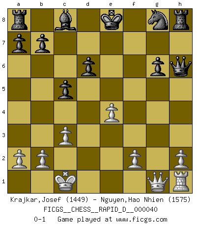 Last move : 0-1 2010 May 29 12:42:51 [Event "FICGS__CHESS__RAPID_D__000040"] [Site "FICGS"] [Date "2010.05.05"] [Round "1"] [White "Krajkar,Josef"] [Black "Nguyen,Hao Nhien"] [Result "0-1"] [WhiteElo "1449"] [BlackElo "1575"] 1.e4 e5 2.Nf3 Nc6 3.Bc4 Nd4 4.Nxe5 Qg5 5.Bxf7+ Ke7 6.Nf3 Qxg2 7.Rf1 Nxf3+ 8.Ke2 Kxf7 9.d3 Nd4+ 10.Ke3 c5 11.c3 Ne6 12.Nd2 g6 13.Nf3 Bh6+ 14.Ke2 Bxc1 15.Rxc1 Qh3 16.Ne5+ Ke8 17.Rh1 d6 18.Nxg6 hxg6 19.Qg1 Nf4+ 20.Ke1 Nxd3+ 21.Kd2 Nxc1 22.Kxc1 Qh6+ 0-1 King's pawn game Player Black won this chess game. Follow this game move after move (download)A Chess game is a dialogue, a conversation between a player and his opponent. Each move by the opponent may contain threats or be a blunder, but a player cannot defend against threats or take advantage of blunders if he does not first ask himself: What is my opponent planning after each move ? (Bruce A. Moon) In Buenos Aires ist es nicht mein vorrangiges Ziel ein starkes Turnier zu organisieren, sondern ein Turnier für Gentlemen. Ich würde nie Kamsky einladen. Ich mag keine Probleme. (Miguel Najdorf) Una victoria por una combinación errónea, aunque sea espectacular, me llena de horror artístico. (Wilhelm Steinitz) Les échecs sont un jeu terrible. Si vous n'avez pas le centre, votre adversaire a une position plus libre. Par contre, si vous avez le centre, alors vous avez vraiment quelque chose pour laquelle vous inquiéter ! (Siegbert Tarrasch) God is an atheist. (Unknown)