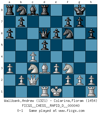 Last move : 0-1 2010 July 7 9:20:23 [Event "FICGS__CHESS__RAPID_D__000040"] [Site "FICGS"] [Date "2010.05.05"] [Round "1"] [White "Wallbank,Andrew"] [Black "Colarina,Floram"] [Result "0-1"] [WhiteElo "1321"] [BlackElo "1454"] 1.d4 Nf6 2.c4 e6 3.Nf3 d5 4.Nc3 Be7 5.Bf4 c5 6.dxc5 Bxc5 7.e3 a6 8.a3 O-O 9.Qc2 Bd6 10.Bxd6 Qxd6 11.Rd1 Rd8 12.Bd3 h6 0-1 This chess game has been lost on time (started : 2010.05.05 12:3:33) Queen's pawn game Kingside Castling by player Black (move 8) Player Black won this chess game. Follow this game move after move (download)It is peculiar but a fact nevertheless, that gamblers in chess always have enthusiastic followers. (Botvinnik) Wenn man heute mit 14 Jahren noch kein GM ist, kann man es vergessen. (Viswanathan Anand) Cuando no sepas que mover, espera por una idea que se le venga a la la cabeza de tu oponente. Tenlo por seguro de que esa idea estará incorrecta. (Siegbert Tarrasch) Nous vivons dans un monde échiquéen : chaque jour qui passe est un défi à relever. (Philosophe Sasha) To send light into the darkness of men's hearts - such is the duty of the artist. (Schumann)