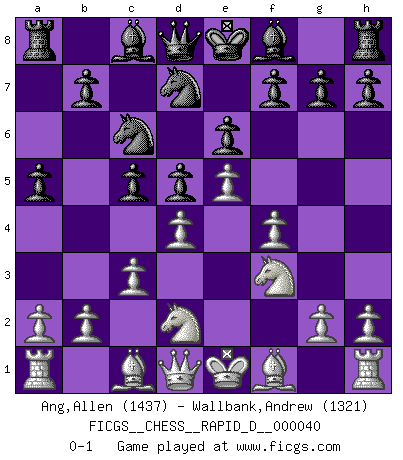 Last move : 0-1 2010 June 19 8:57:28 [Event "FICGS__CHESS__RAPID_D__000040"] [Site "FICGS"] [Date "2010.05.05"] [Round "1"] [White "Ang,Allen"] [Black "Wallbank,Andrew"] [Result "0-1"] [WhiteElo "1437"] [BlackElo "1321"] 1.e4 e6 2.d4 d5 3.Nd2 Nf6 4.e5 Nfd7 5.f4 c5 6.c3 Nc6 7.Ngf3 a5 0-1 This chess game has been lost on time (started : 2010.05.05 12:3:33) French : Tarrasch, Closed variation Player Black won this chess game. Follow this game move after move (download)Botvinnik tried to take the mystery out of Chess, always relating it to situations in ordinary life. He used to call Chess a typical inexact problem similar to those which people are always having to solve in everyday life. (Garry Kasparov) Schach ist ein Kampf gegen den Fehler. (Johannes Herrman Zukertort) La partida mas dura de ganar es una partida ganada. (Emanuel Lasker) Avant la finale, les dieux ont créé le milieu de partie. (Tarrasch) Crush them ! Make them suffer ! (General Grievous in Star Wars ep.3)