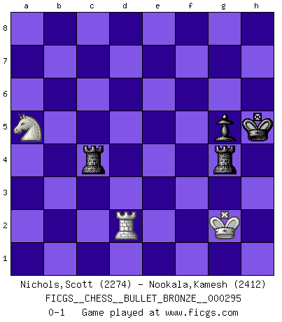 Last move : 0-1 2010 May 5 20:19:57 [Event "FICGS__CHESS__BULLET_BRONZE__000295"] [Site "FICGS"] [Date "2010.05.05"] [Round "1"] [White "Nichols,Scott"] [Black "Nookala,Kamesh"] [Result "0-1"] [WhiteElo "2274"] [BlackElo "2412"] 1.e4 e5 2.Nf3 Nc6 3.Bb5 a6 4.Ba4 Nf6 5.O-O Be7 6.Re1 b5 7.Bb3 d6 8.c3 O-O 9.h3 Bb7 10.d4 Re8 11.Nbd2 Bf8 12.d5 Nb8 13.Nf1 Nbd7 14.N3h2 Nc5 15.Bc2 c6 16.b4 Ncd7 17.dxc6 Bxc6 18.Bg5 Qc7 19.Ng4 Nxg4 20.Qxg4 Nb6 21.Bb3 Bd7 22.Qf3 Be6 23.Bxe6 fxe6 24.Be3 Na4 25.Rac1 Rac8 26.Bd2 Qf7 27.Qg3 Rc6 28.Qg4 Rc4 29.Re3 d5 30.a3 Be7 31.Rf3 Bf6 32.Ng3 Qg6 33.Re1 Qxg4 34.hxg4 Rd8 35.g5 Be7 36.exd5 Rxd5 37.Nf1 Rc7 38.Re2 Rcd7 39.Kh2 Bd8 40.Rg3 Kf7 41.Kh3 Nb2 42.Rg4 Nc4 43.Be1 Rd3+ 44.f3 Rc7 45.Ng3 Ne3 46.Rh4 Bxg5 47.Rxh7 Nd5 48.Rxe5 Kg8 49.Ne4 Be7 50.Reh5 Nf4+ 51.Kg4 Nxh5 52.Rxh5 Rd1 53.Bg3 Rc6 54.Bf4 Ra1 55.Bg5 Bd6 56.Bf4 Bxf4 57.Kxf4 Rxa3 58.Rh1 Ra2 59.g3 Re2 60.Rd1 Kf7 61.Rd7+ Kg6 62.Rd1 Rh2 63.g4 Re2 64.Rd7 e5+ 65.Kxe5 Rxc3 66.Rd6+ Kh7 67.Kf4 Rc8 68.Ng5+ Kh8 69.Rxa6 Rb2 70.Rb6 Rxb4+ 71.Kg3 Rb1 72.Nf7+ Kg8 73.Nd6 Rf8 74.Rxb5 Rg1+ 75.Kh4 Rxf3 76.Kg5 Rd3 77.Nf5 Rd7 78.Rb4 Ra7 79.Re4 Kh7 80.Nh4 Ra6 81.Rd4 Rga1 82.Rd7 Ra7 83.Rd2 R7a4 84.Rh2 Kg8 85.Rc2 Rg1 86.Ng2 Kh7 87.Ne3 Re4 88.Ng2 Re6 89.Kf5 Rf6+ 90.Kg5 Rg6+ 91.Kf4 Rf1+ 92.Kg3 Rd6 93.Nf4 Ra6 94.g5 Ra4 95.Rh2+ Kg8 96.Nh3 Kf7 97.Rb2 Rc1 98.Rb7+ Kg8 99.Rb3 Kh7 100.Kf3 R1c4 101.Nf2 Kg6 102.Nd3 Kxg5 103.Rb7 Kh6 104.Rb3 Kh5 105.Ne5 Rcb4 106.Rd3 Re4 107.Nc6 g5 108.Rd2 Rac4 109.Na5 Rf4+ 110.Kg2 Rg4+ 0-1 Ruy Lopez : Closed Kingside Castling by player White (move 5) Kingside Castling by player Black (move 8) 10 pieces endgame at move 70 : White KRNPP , Black KRRPP WHITE : King + 1 Rook 1 Knight 2 Pawns BLACK : King + 2 Rooks 2 Pawns 9 pieces endgame at move 74 : White KRNPP , Black KRRP WHITE : King + 1 Rook 1 Knight 2 Pawns BLACK : King + 2 Rooks 1 Pawn 8 pieces endgame at move 75 : White KRNP , Black KRRP WHITE : King + 1 Rook 1 Knight 1 Pawn BLACK : King + 2 Rooks 1 Pawn 7 pieces endgame at move 102 : White KRN , Black KRRP WHITE : King + 1 Rook 1 Knight BLACK : King + 2 Rooks 1 Pawn Player Black won this chess game. Follow this game move after move (download)If a ruler does not understand Chess, how can he rule over a kingdom ? (King Khusros II) Stelle das Brett so, daß die Sonne in die Augen deines Gegners scheint. (Ruy López) El estómago es una parte esencial del maestro de Ajedrez. (Bent Larsen) Le temps de noter son nom sur la feuille de partie, j'étais déjà en zeitnot ! D'un modeste amateur apparié lors de la première ronde d'un open contre le grand-maître Azmaïparashvili. If you have any trouble condescending, find a Unix user to show you how it's done. (Scott Adams)
