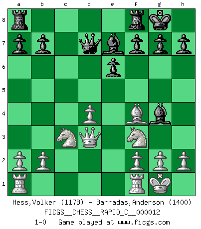 Last move : 1-0 2006 December 17 0:43:58 [Event "FICGS__CHESS__RAPID_C__000012"] [Site "FICGS"] [Date "2006.11.01"] [Round "1"] [White "Hess,Volker"] [Black "Barradas,Anderson"] [Result "1-0"] [WhiteElo "1178"] [BlackElo "1400"] 1.e4 c5 2.c3 d5 3.exd5 Qxd5 4.d4 cxd4 5.cxd4 Nc6 6.Nf3 Bg4 7.Nc3 Qd8 8.Be3 Nf6 9.Bb5 e6 10.O-O Be7 11.Bxc6+ Nd7 12.Bxd7+ Qxd7 13.Bf4 O-O 14.Qd3 1-0 This chess game has been lost on time (started : 2006.11.01 12:28:28) Sicilian : Alapin's variation (2.c3) Kingside Castling by player White (move 10) Kingside Castling by player Black (move 13) Player White won this chess game. Follow this game move after move (download)Chess is war over the board. The object is to crush the opponents mind. (Bobby Fischer) Ohne Leiden bildet sich kein Charakter. (Ernst Freiherr von Feuchtersleben) Realmente no sabemos como el juego fue inventado, aunque hay sospechas. Tan pronto como descubramos a los culpables, se los haremos saber. (Bruce Pandolfini) Je crois qu'il existe des manières très spécifiques de jouer efficacement contre une machine. Evidemment, nous n'avons aucune chance en technique pure, parce que l'ordinateur calcule de manière parfaite. Mais lorsque nous faisons appel à notre cerveau, en utilisant l'intuition et la compréhension, alors nous restons beaucoup plus forts. (Anatoli Karpov) Inventor: A person who makes an ingenious arrangement of wheels, levers and springs, and believes it civilization. (Ambrose Bierce, The Devil's Dictionary)