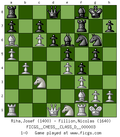 Last move : 1-0 2006 July 24 2:42:25 [Event "FICGS__CHESS__CLASS_D__000003"] [Site "FICGS"] [Date "2006.04.26"] [Round "1"] [White "Riha,Josef"] [Black "Fillion,Nicolas"] [Result "1-0"] [WhiteElo "1400"] [BlackElo "1640"] 1.d4 Nf6 2.c4 g6 3.Nc3 Bg7 4.e4 d6 5.Nf3 O-O 6.Be2 e5 7.O-O Nc6 8.d5 Ne7 9.Ne1 Nd7 10.Be3 f5 11.f3 f4 12.Bf2 g5 13.a4 Ng6 14.a5 Rf7 15.b4 Nf6 16.c5 Bf8 17.c6 bxc6 18.dxc6 Be6 19.Ba6 1-0 This chess game has been lost on time (started : 2006.04.26 12:13:16) King's Indian : Orthodox, Aronin-Taimanov variation (Yugoslav attack / Mar del Plata variation) Kingside Castling by player Black (move 5) Kingside Castling by player White (move 7) Player White won this chess game. Follow this game move after move (download)One doesn't have to play well, it's enough to play better than your opponent. (Siegbert Tarrasch) Mein erstes Ziel war nicht, die Partie zu gewinnen, sondern eine Figur zu opfern. -- der junge (Wilhelm Steinitz) Solo los afeminados hacen el Enroque. (Rob Sillars) Ne tendez aucun piège pour le plaisir ! Ne jouez rien dans l'espoir que l'adversaire réagisse de façon stupide ! Prenez toujours pour acquis que l'adversaire va trouver le meilleur coup ! Ne jouez jamais de coup dans l'espoir que l'adversaire ne voie pas la menace ! Chacun de vos coups doit améliorer la position d'une façon ou d'une autre. All maxims have their antagonist maxims; proverbs should be sold in pairs, a single one being but a half truth. (William Mathews)