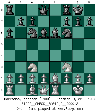 Last move : 0-1 2006 December 15 6:30:24 [Event "FICGS__CHESS__RAPID_C__000012"] [Site "FICGS"] [Date "2006.11.01"] [Round "1"] [White "Barradas,Anderson"] [Black "Freeman,Tyler"] [Result "0-1"] [WhiteElo "1400"] [BlackElo "1400"] 1.e4 d5 2.exd5 Nf6 3.Nc3 e6 4.dxe6 Bxe6 5.Nf3 Bd6 6.Be2 Nc6 7.O-O a6 8.Re1 O-O 0-1 This chess game has been lost on time (started : 2006.11.01 12:28:28) Scandinavian defense Kingside Castling by player White (move 7) Kingside Castling by player Black (move 8) Player Black won this chess game. Follow this game move after move (download)Look at Garry Kasparov. After he loses, invariably he wins the next game. He just kills the next guy. That's something that we have to learn to be able to do. (Maurice Ashley) Über Karpov: Er war und ist ein Vertreter der russischen Reaktionäre. Das steckt tief in seiner Seele, wehalb ich nicht nett mit ihm umgehen kann. (Viktor Kortschnoi) Siempre es mucho mejor sacrificar las piezas de tu oponente. (Savielly Tartakover) Des combinaisons [dans le jeu d'échecs] pareilles à des mélodies. Je crois entendre pour ainsi dire la musique des coups... (Vladimir Nabokov) I've lost money so fast in these clubs it's left me reeling. I've read every poker book ever written, but the only way to get better at the game is to go out and play with people who are really good. The problem is, you stand to lose a lot of money doing it. (Matt Damon)
