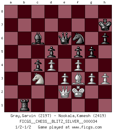 Last move : 1/2-1/2 2010 May 7 22:8:49 [Event "FICGS__CHESS__BLITZ_SILVER__000034"] [Site "FICGS"] [Date "2010.05.07"] [Round "1"] [White "Gray,Garvin"] [Black "Nookala,Kamesh"] [Result "1/2-1/2"] [WhiteElo "2197"] [BlackElo "2419"] 1.c4 e6 2.a3 b6 3.d4 Nf6 4.Nf3 Bb7 5.Nc3 d5 6.cxd5 Nxd5 7.Bd2 Nd7 8.Nxd5 exd5 9.g3 Bd6 10.Bg5 Nf6 11.Bg2 O-O 12.Ne5 Be7 13.Be3 Re8 14.O-O c5 15.f4 Bd6 16.a4 Qc7 17.Rc1 Rac8 18.Bf3 c4 19.Bd2 a6 20.b3 b5 21.e3 Qb6 22.axb5 axb5 23.Rc2 Qc7 24.Qe1 Ra8 25.Bb4 Reb8 26.Qd2 Ne8 27.Rb1 f6 28.Nd3 Bxb4 29.Nxb4 Qd6 30.Ra2 Rxa2 31.Nxa2 f5 32.h3 Nf6 33.Kf2 Bc6 34.Qb4 Qe6 35.Nc3 h6 36.Ra1 Re8 37.Re1 Re7 38.bxc4 bxc4 39.Qb8+ Kh7 40.Qe5 Qd7 41.Qb8 Re8 42.Qb2 Qe6 43.Qc2 g5 44.Qe2 Rb8 45.Rb1 Rxb1 1/2-1/2 English Opening Kingside Castling by player Black (move 11) Kingside Castling by player White (move 14) This chess game ended in a draw. Follow this game move after move (download)To avoid losing a piece, many a person has lost the game. (Savielly Tartakover) Du musst Deinen Gegner in einen tiefen dunklen Wald führen wo 2+2=5 ist und wo der Weg, der wieder hinausführt, nur breit genug für einen ist. (Mikhail Nekhemyevich Tal) El Ajedrez es como la guerra en un tablero. (Bobby Fischer) Des combinaisons [dans le jeu d'échecs] pareilles à des mélodies. Je crois entendre pour ainsi dire la musique des coups... (Vladimir Nabokov) Gambling is the son of avarice and the father of despair. (French proverb)