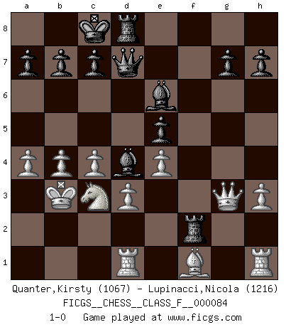 Last move : 1-0 2010 October 13 9:47:43 [Event "FICGS__CHESS__CLASS_F__000084"] [Site "FICGS"] [Date "2010.05.07"] [Round "1"] [White "Quanter,Kirsty"] [Black "Lupinacci,Nicola"] [Result "1-0"] [WhiteElo "1067"] [BlackElo "1216"] 1.e4 d5 2.f3 dxe4 3.fxe4 e5 4.Nf3 Bg4 5.h3 Bh5 6.g4 Bg6 7.d3 Nc6 8.Bg5 f6 9.Bh4 Qd7 10.a3 O-O-O 11.b4 Bf7 12.c4 Nd4 13.g5 Nxf3+ 14.Qxf3 Be7 15.gxf6 Nxf6 16.Bxf6 Bxf6 17.Nc3 Rhf8 18.O-O-O Bg5+ 19.Kc2 Be6 20.Qg3 Bf4 21.Qg2 Be3 22.Qg3 Rf2+ 23.Kb3 Bd4 24.a4 1-0 This chess game has been lost on time (started : 2010.05.07 20:22:24) Scandinavian (centre counter) defense Queenside Castling by player Black (move 10) Queenside Castling by player White (move 18) Player White won this chess game. Follow this game move after move (download)Chess is a matter of delicate judgment, knowing when to punch and how to duck. (Bobby Fischer) Nie in meinem Leben habe ich die französische Verteidigung gespielt, welche die Stumpfsinnigste von allen ist. (Wilhelm Steinitz) A la fecha, Fischer esta simplemente un nivel arriba de todos los mejores jugadores de Ajedrez del mundo. (John Jacobs) La vie est comme un jeu d'échecs : nous esquissons un plan, mais celui-ci est tributaire de ce que daignent faire l'adversaire aux échecs et le destin dans la vie. (Arthur Schopenhauer) A bird doesn't sing because it has an answer, it sings because it has a song. (Maya Angelou)