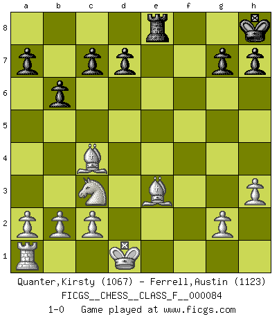 Last move : 1-0 2010 May 20 3:58:14 [Event "FICGS__CHESS__CLASS_F__000084"] [Site "FICGS"] [Date "2010.05.07"] [Round "1"] [White "Quanter,Kirsty"] [Black "Ferrell,Austin"] [Result "1-0"] [WhiteElo "1067"] [BlackElo "1123"] 1.e4 e5 2.d4 exd4 3.Qxd4 Nc6 4.Qe3 Nf6 5.h3 Bc5 6.Qxc5 Nxe4 7.Qe3 f5 8.f3 Qh4+ 9.Ke2 b6 10.fxe4 Ne7 11.exf5 Bb7 12.Nf3 Bxf3+ 13.Qxf3 O-O 14.Nc3 Rxf5 15.Qe4 Qf2+ 16.Kd1 Re8 17.Bc4+ Kh8 18.Rf1 Qc5 19.Rxf5 Qxf5 20.Qxf5 Nxf5 21.Bf4 Ne3+ 22.Bxe3 1-0 Centre game : Berger variation Kingside Castling by player Black (move 13) Player White won this chess game. Follow this game move after move (download)The older I grow, the more I value Pawns. (Keres) Die Jungen erwarten, dass Opa einfach umfällt. Dann aber kann Opa fünf Stunden lang Schach spielen und die jungen Gegner an die Wand drücken. (Viktor Kortschnoi) Yo adoro todas la posiciones. Denme una partida posicional difícil, y la jugaré. Pero posiciones totalmente ganadas, no las tolero. (Hein Donner) Le jeu d'échecs est comme rejeté hors du temps. (Antoine de Saint-Exupéry) When you've done things right people won't know you've done anything at all. (Futurama)