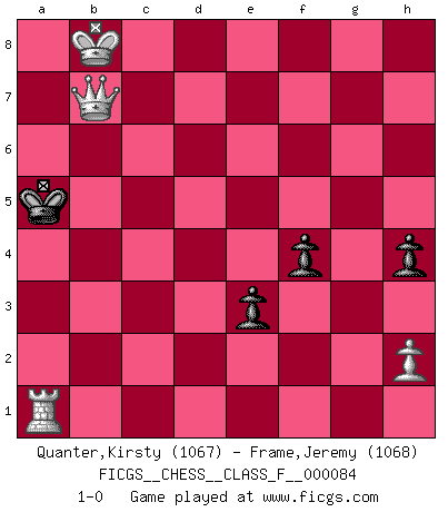 Last move : 1-0 2010 June 18 21:4:30 [Event "FICGS__CHESS__CLASS_F__000084"] [Site "FICGS"] [Date "2010.05.07"] [Round "1"] [White "Quanter,Kirsty"] [Black "Frame,Jeremy"] [Result "1-0"] [WhiteElo "1067"] [BlackElo "1068"] 1.e4 e5 2.Nf3 Nf6 3.d4 Nxe4 4.Nxe5 d5 5.f3 Qh4+ 6.Ke2 Qf2+ 7.Kd3 Bf5 8.fxe4 Bxe4+ 9.Kc3 Nc6 10.Nxc6 bxc6 11.g4 Bd6 12.Bg2 Qxg2 13.Re1 O-O 14.Qe2 Qxe2 15.Rxe2 Rab8 16.a3 Rfe8 17.Nd2 Bf4 18.Nxe4 Bxc1 19.Rxc1 Rxe4 20.Rxe4 dxe4 21.Re1 Re8 22.Kc4 g6 23.Kc5 Re6 24.c4 f5 25.d5 cxd5 26.cxd5 Re5 27.Kc6 h6 28.d6 cxd6 29.Kxd6 Rb5 30.b4 a5 31.Kc6 Rb8 32.bxa5 Kf7 33.a6 Rb3 34.a4 Ra3 35.Kb5 Rb3+ 36.Ka5 Rb8 37.a7 Ra8 38.Kb6 Ke7 39.Kb7 Rh8 40.a8Q Rxa8 41.Kxa8 Kd6 42.gxf5 gxf5 43.a5 Kc7 44.a6 h5 45.a7 h4 46.Rc1+ Kb6 47.Kb8 e3 48.a8Q f4 49.Qb7+ Ka5 50.Ra1+ 1-0 Petrov : Modern attack, Symmetrical variation Kingside Castling by player Black (move 13) Promotion Queen by player White (move 40) 10 pieces endgame at move 41 : White KRPPP , Black KPPPP WHITE : King + 1 Rook 3 Pawns BLACK : King + 4 Pawns 9 pieces endgame at move 42 : White KRPPP , Black KPPP WHITE : King + 1 Rook 3 Pawns BLACK : King + 3 Pawns 8 pieces endgame at move 42 : White KRPP , Black KPPP WHITE : King + 1 Rook 2 Pawns BLACK : King + 3 Pawns Promotion Queen by player White (move 48) Player White won this chess game. Follow this game move after move (download)Chess is ruthless: you've got to be prepared to kill people. (Nigel Short) Habe Mut, dich deines eigenen Verstandes zu bedienen. (Immanuel Kant) ¿Que sería del Ajedrez sin errores graciosos?. (Kurt Richter) Que feriez-vous si vous étiez en train de jouer aux échecs et que la fin du monde arrive ? Je continuerais à jouer. (Saint Borromée) Begin at the beginning and go on till you come to the end; then stop. (Lewis Carrol, Alice in Wonderland)