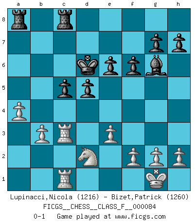 Last move : 0-1 2010 October 7 9:23:25 [Event "FICGS__CHESS__CLASS_F__000084"] [Site "FICGS"] [Date "2010.05.07"] [Round "1"] [White "Lupinacci,Nicola"] [Black "Bizet,Patrick"] [Result "0-1"] [WhiteElo "1216"] [BlackElo "1260"] 1.d4 d5 2.c4 c6 3.Nc3 Nf6 4.Nf3 Bf5 5.Qb3 Qb6 6.Qxb6 axb6 7.cxd5 Nxd5 8.Nxd5 cxd5 9.e3 e6 10.Bb5+ Ke7 11.b3 Nc6 12.O-O f6 13.a4 Bc2 14.Ba3+ Kd7 15.Bxf8 Rhxf8 16.Nd2 Kd6 17.Bxc6 bxc6 18.Rfc1 Bg6 19.Rc3 Rfc8 20.Rac1 c5 21.dxc5+ bxc5 0-1 This chess game has been lost on time (started : 2010.05.07 20:22:24) QGD Slav defense Kingside Castling by player White (move 12) Player Black won this chess game. Follow this game move after move (download)Fischer prefers to enter Chess history alone. (Miguel Najdorf) Ohne Fehler kann es keine Brillanz geben. (Emanuel Lasker) Puntos débiles o agujeros en la posición de tu oponente deben de ser ocupados por piezas, no Peones. (Siegbert Tarrasch) Assurément je connaissais par expérience le mystérieux attrait de ce jeu royal, le seul entre tous les jeux inventés par les hommes qui échappe souverainement à la tyrannie du hasard, le seul où l'on ne doive sa victoire qu'à son intelligence ou plutôt à une certaine forme d'intelligence. Mais n'est-ce pas déjà le limiter injurieusement que d'appeler les échecs un jeu ? N'est-ce pas une science, un art ou quelque chose qui, comme le cercueil de Mahomet entre ciel et terre, est suspendu entre l'un et l'autre, et qui réunit un nombre incroyable de contraires ? [...] C'est une pensée qui ne mène à rien, une mathématique qui n'établit rien, un art qui ne laisse pas d'uvre, une architecture sans matière; et il l'a prouvé néanmoins qu'il était plus durable, à sa manière, que les livres ou que tout autre monument, ce jeu unique qui appartient à tous les peuples et à tous les temps, et dont personne ne sait quel dieu en fit don à la terre pour tuer l'ennui, pour aiguiser l'esprit et stimuler l'âme. Où commence-t-il, où finit-il ? (Stefan Zweig) I think your argument is specious - I think your tie is ugly. (Gregory House to Dr. Foreman, House M.D.)