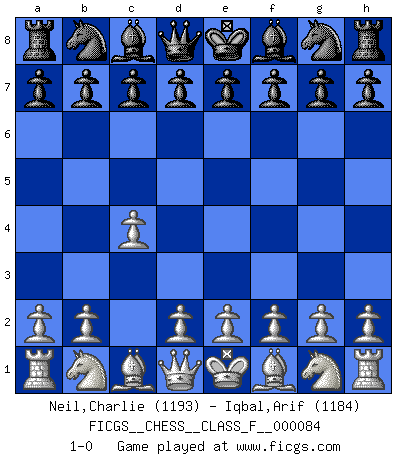 Last move : 1-0 2010 June 21 8:55:23 [Event "FICGS__CHESS__CLASS_F__000084"] [Site "FICGS"] [Date "2010.05.07"] [Round "1"] [White "Neil,Charlie"] [Black "Iqbal,Arif"] [Result "1-0"] [WhiteElo "1193"] [BlackElo "1184"] 1.c4 1-0 This chess game has been lost on time (started : 2010.05.07 20:22:24) English Opening Player White won this chess game. Follow this game move after move (download)Examine moves that smite! A good eye for smites is far more important than a knowledge of strategical principles. (Purdy) Warum muß ich gegen diesen IDIOTEN verlieren? (Aaron Nimzowitsch) Dejen al perfeccionista jugar por correo. (Yasser Seirawan) Les échecs, c'est l'imagination. (David Bronstein) The problem with troubleshooting is that trouble shoots back. (Anonymous)