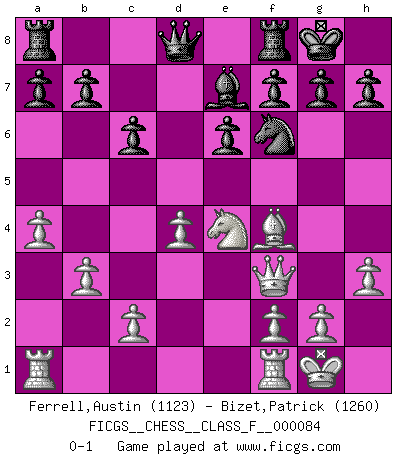 Last move : 0-1 2010 July 26 21:43:28 [Event "FICGS__CHESS__CLASS_F__000084"] [Site "FICGS"] [Date "2010.05.07"] [Round "1"] [White "Ferrell,Austin"] [Black "Bizet,Patrick"] [Result "0-1"] [WhiteElo "1123"] [BlackElo "1260"] 1.e4 c6 2.d4 d5 3.Nc3 Nf6 4.Bd3 Bg4 5.Nf3 e6 6.O-O Be7 7.h3 Bh5 8.b3 O-O 9.Bf4 Nxe4 10.Bxe4 dxe4 11.Nxe4 Bxf3 12.Qxf3 Nd7 13.a4 Nf6 0-1 Caro-Kann defense Kingside Castling by player White (move 6) Kingside Castling by player Black (move 8) Player Black won this chess game. Follow this game move after move (download)By the beauty of his games, the clarity of his play, and the brilliance of his ideas, Fischer made himself an artist of the same stature as Brahms, Rembrandt, and Shakespeare. (David Levy) Wer mein Gambit spielt, muß bereit sein, alle Brücken hinter sich abzubrechen. Es verändert den ganzen Menschen. Es wirkt wie ein Zauberstab und fördert verkümmerte, gute Charakter- eigenschaften wieder zu Tage. (Emil Joseph Diemer) A la fecha, Fischer esta simplemente un nivel arriba de todos los mejores jugadores de Ajedrez del mundo. (John Jacobs) En blitz, le Cavalier l'emporte sur le Fou. (Vlastimil Hort) My poor ole parrot... Is not in the circulation of displays ....poo hoo hoo :) (Wayne Lowrance's enigma)